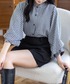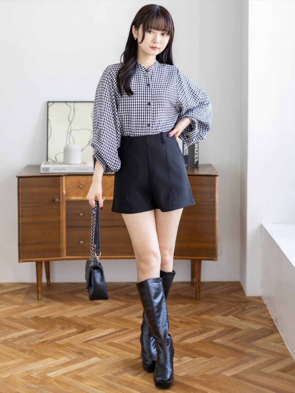 ギンガムブラウスをショートパンツで大人ガーリーにまとめたコーデ