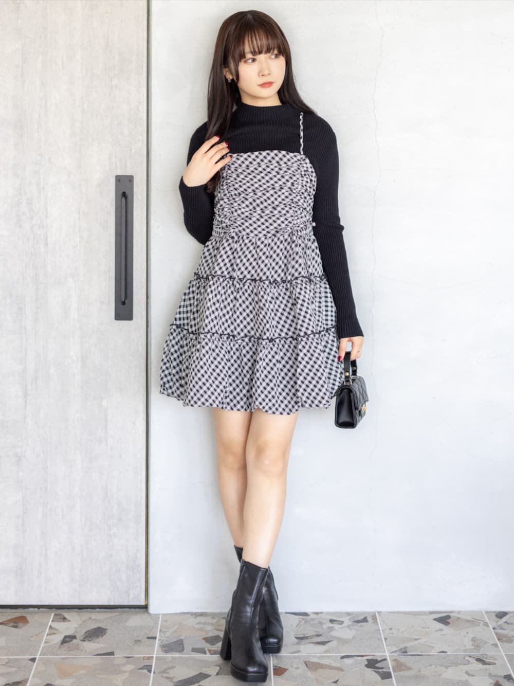 ギンガムキャミワンピを黒ニットで引き締めた大人ガーリーコーデ