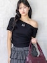 大胆すぎない肌見せが魅力のワンショルダーリブトップス。 フィット感のあるリブ素材でボディラインをすっきりと見せ、胸元のロゴ刺繍がさりげないアクセントに。 シンプルながらも一枚で着映えするデザインです。 チェック柄のティアードミニスカートと合わせれば、甘さとエッジをバランスよく取り入れたトレンドスタイルに。 コンパクトなトップスだからこそ、ボリュームのあるボトムとも好相性。 デイリーコーデはもちろん、お出かけシーンにも活躍する主役級アイテムです。
