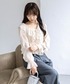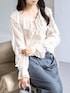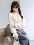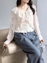 繊細なフリルが目を惹くフェミニンブラウス。 軽やかなシアー素材とたっぷりのラッフルデザインが、華やかで女性らしい印象を演出。 ウエスト部分のシャーリングがメリハリのあるシルエットを叶え、自然とスタイルアップ見えも実現します。 落ち感のあるワイドパンツと合わせれば、甘さを程よく抑えた大人のきれいめスタイルに。 動くたびに揺れるディテールが、コーディネートに奥行きをプラスします。 特別なお出かけからデイリーまで活躍する、主役級ブラウスです。