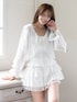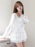 繊細なフリルとシアー素材が華やかさを引き立てるフェミニンブラウス。 軽やかに揺れるラッフルデザインと、ウエスト部分のシャーリングがメリハリのあるシルエットを演出。 ふんわりとした袖ディテールが、より一層女性らしい印象をプラスします。 ティアードミニスカートと合わせれば、甘さたっぷりの大人ガーリースタイルに。 レース裾がさりげないアクセントになり、動くたびに華やぎます。 デートや特別なお出かけにもぴったりな、主役級アイテムです。