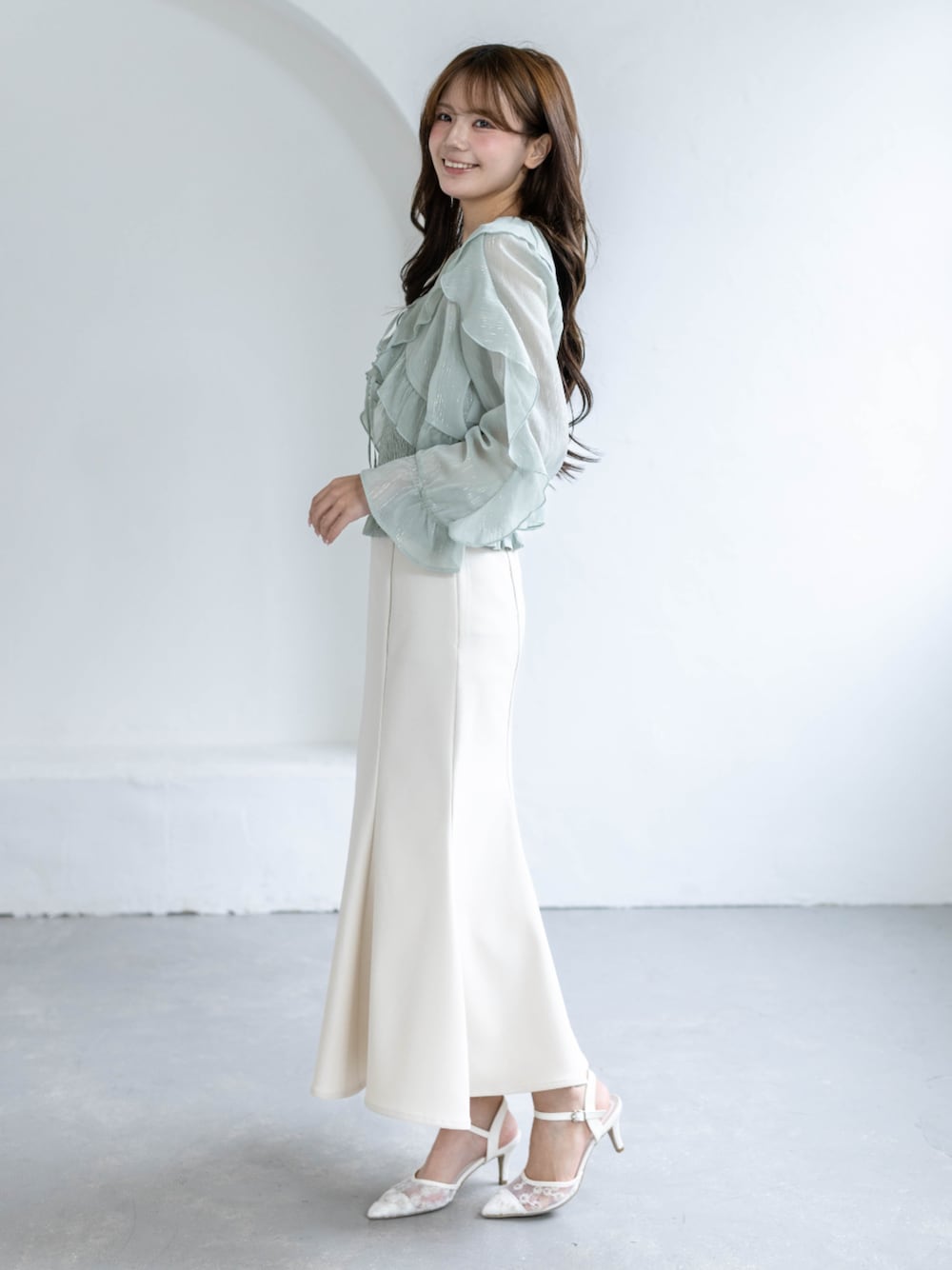 春になると着たくなる、大好きなミントグリーンを主役にしたコーディネート。 フリルたっぷりのブラウスは、ほんのり透け感があって、着るだけで顔周りをパッと華やかに見せてくれます。 ボトムスはアイボリーのロングスカートを合わせて、全体を淡いトーンでまとめました。 「爽やかさ」と「可愛らしさ」を両立させた、今の時期にぴったりのスタイルです🕊️