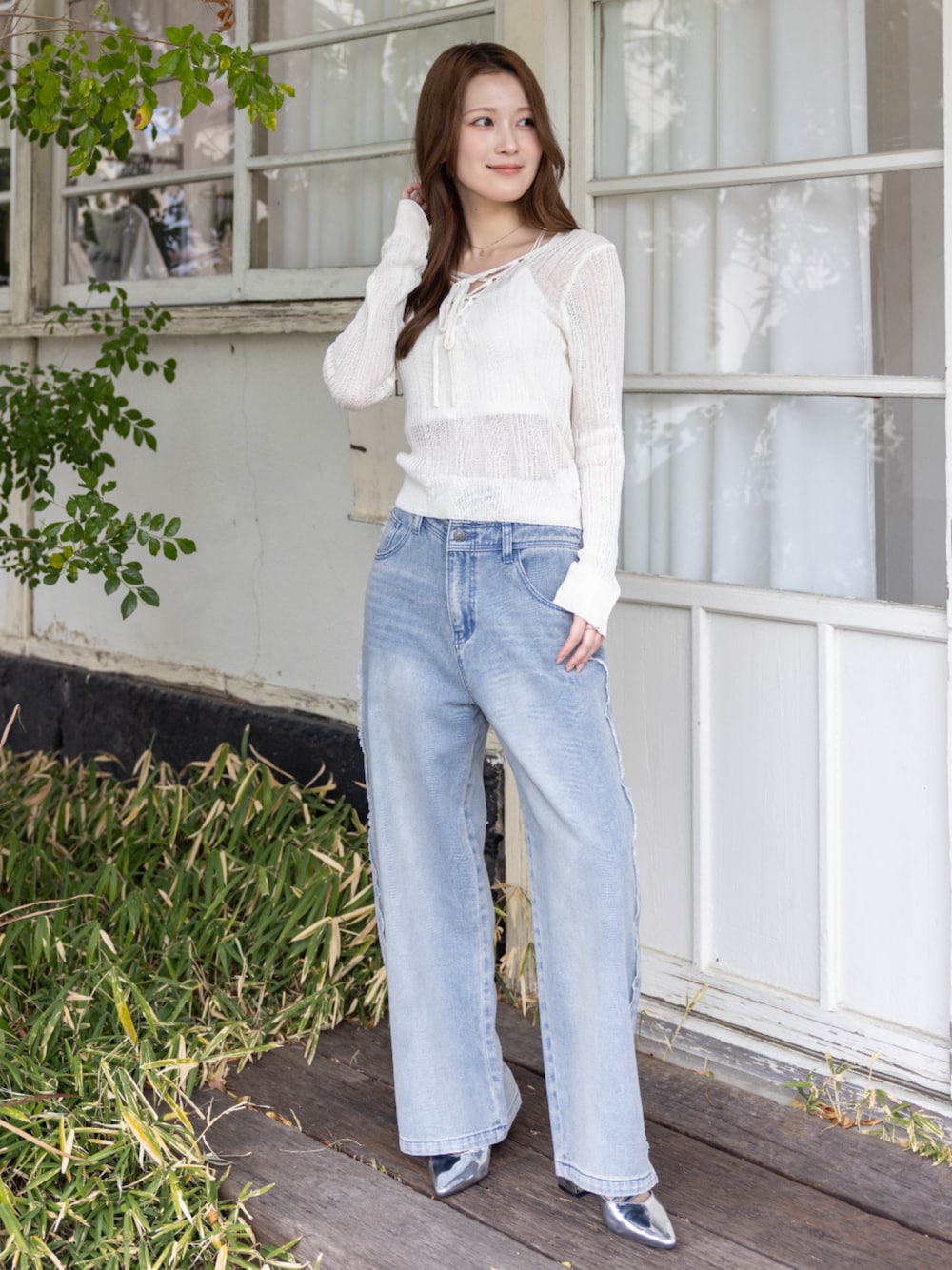 フロントのレースアップデザインがポイントのニットを主役に。 程よい透け感が女性らしさを引き立ててくれて、1枚でトレンド感たっぷりの着こなし。 ボトムスはあえてルーズなワイドデニムを合わせて、甘さを抑えた「大人の休日スタイル」が今の気分です👖 仕上げにシルバーのパンプスをプラスして、コーデに華やかさとエッジを効かせました。