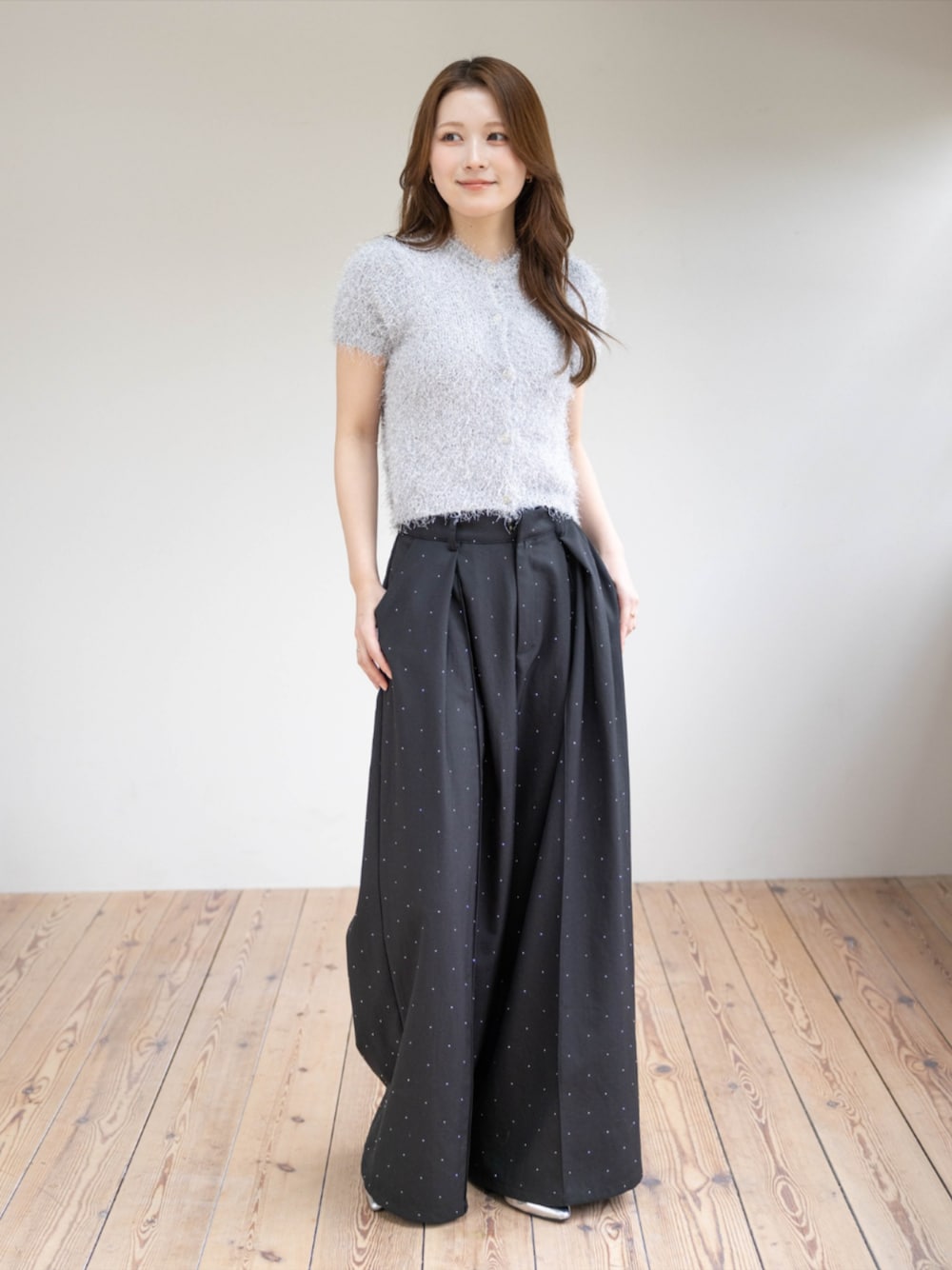 ふんわりとしたフェザーニットが印象的なショートスリーブトップス。 柔らかな質感が女性らしさを引き立て、シンプルながらも存在感のある一枚に。コンパクトな丈感で、バランスよく着こなせます。 さりげなくきらめくラインストーン入りワイドパンツと合わせれば、上品さの中に華やぎをプラス。リラックス感ときれいめを両立した、大人のデイリースタイルが完成します。