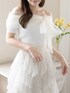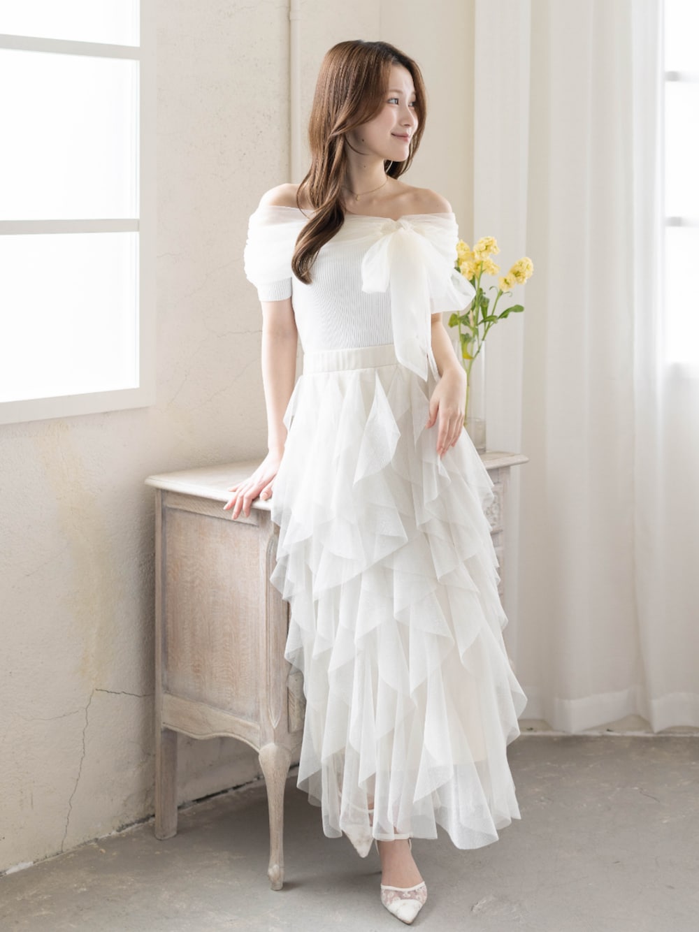 お気に入りのオフショルリボンとティアードスカート。 全身を白でまとめて、とびきりロマンチックに。 春の光に映える、透明感たっぷりのコーディネートです🕊️