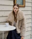 【ノエルセットアップ】 カジュアルに見えがちなケーブル柄ですが、すっきりとしたシルエットが女性らしい雰囲気にしてくれます。 スカートはタイトめなシルエットですが、ニットで伸縮性があるのと、後ろのスリットで着心地◎ 【グランカラーファージャケット】 柔らかくふわふわした触り心地がとっても気持ちいいフェイクファージャケット。 ボリュームが出過ぎてしまうかも?と思われがちなファーコートですが、計算されたボリューム感とシルエットで、すっきりまとまるシルエットを実現してくれます。 少し大きめな襟でお顔が小さく見えるのも嬉しい◎
