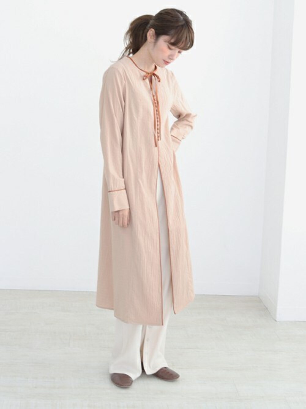 ネックのリボンがかわいい春らしいワンピースです♡ ゆるっとしたパンツと合わせてリラクシーな雰囲気に仕上げました✨ 体のラインを拾わないシルエットも嬉しいポイントですね◎