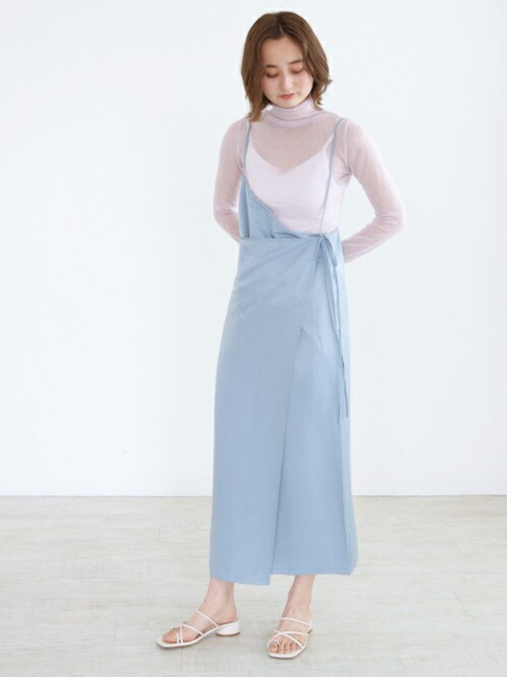 アシンメトリーなワンピースにシアーニットを合わせたガーリースタイル◎ 足元はサンダルで抜け感を出しました♡