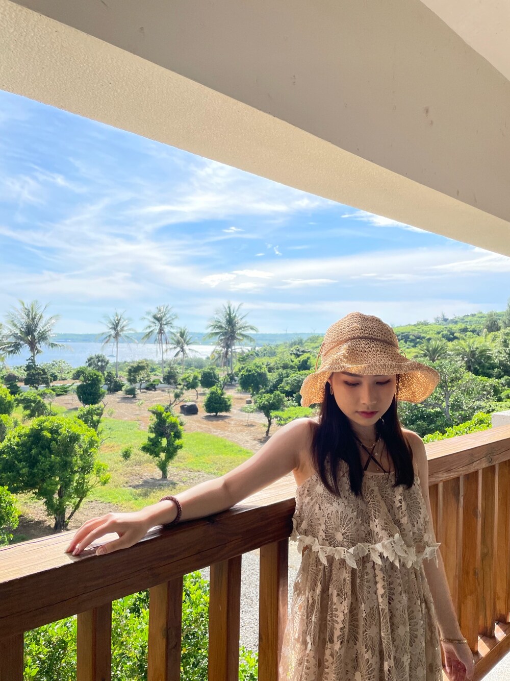 ベージュ系のワンピースを着用したレディースの夏コーディネートの1枚目の写真