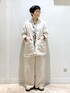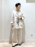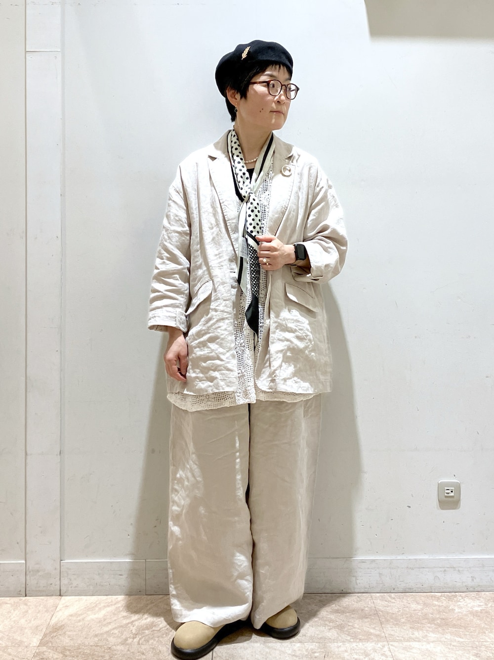 オケージョンにも使用可能なフレンチリネンのセットアップ。 リネン好きな方にオススメなアイテム。ベージュのワントーンに柄のスカーフを差し色に。