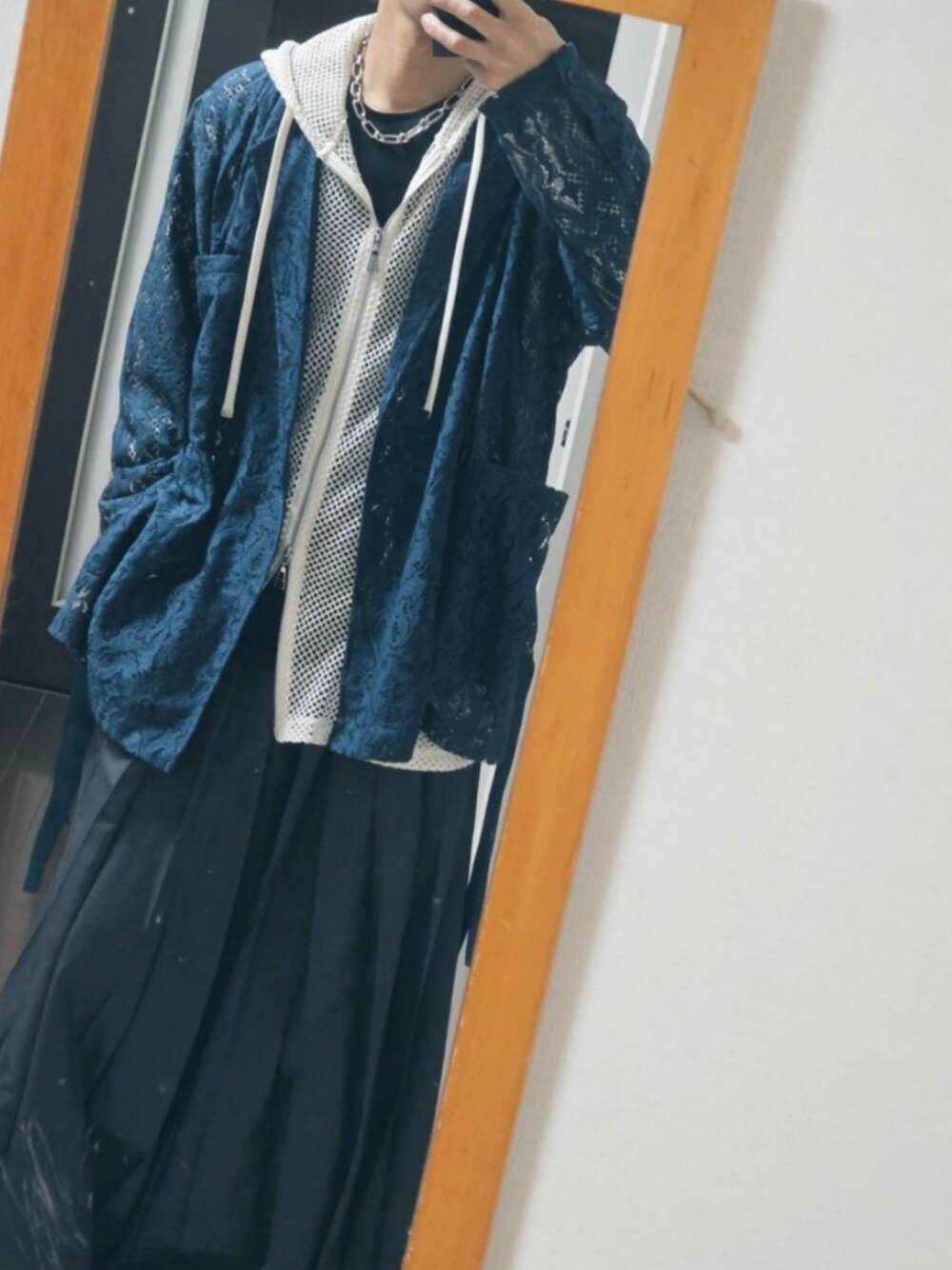 白メッシュパーカーに青レースジャケットを合わせたゆるモードなコーデ。ジャケットは丈長デザインなので、パンツはワイドがおすすめ。