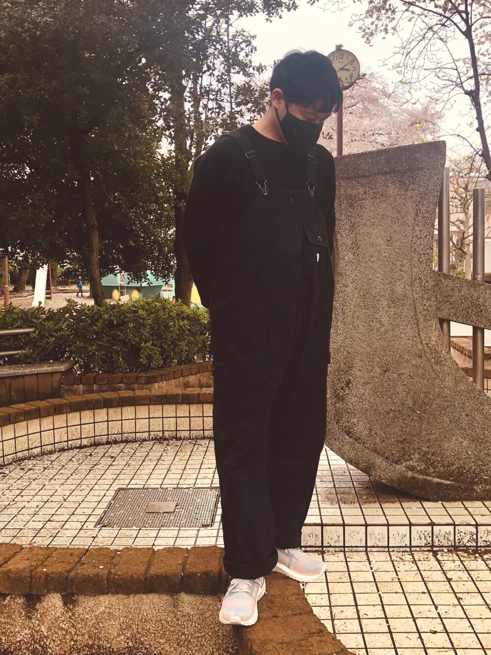 人生初のオーバーオール。 フリークスストアで購入したGUNG HOのブラック。 まだちょっと気慣れないので、トップスはSigのミラノリブクルーネックニットで、少しきれいめなものを選びました。