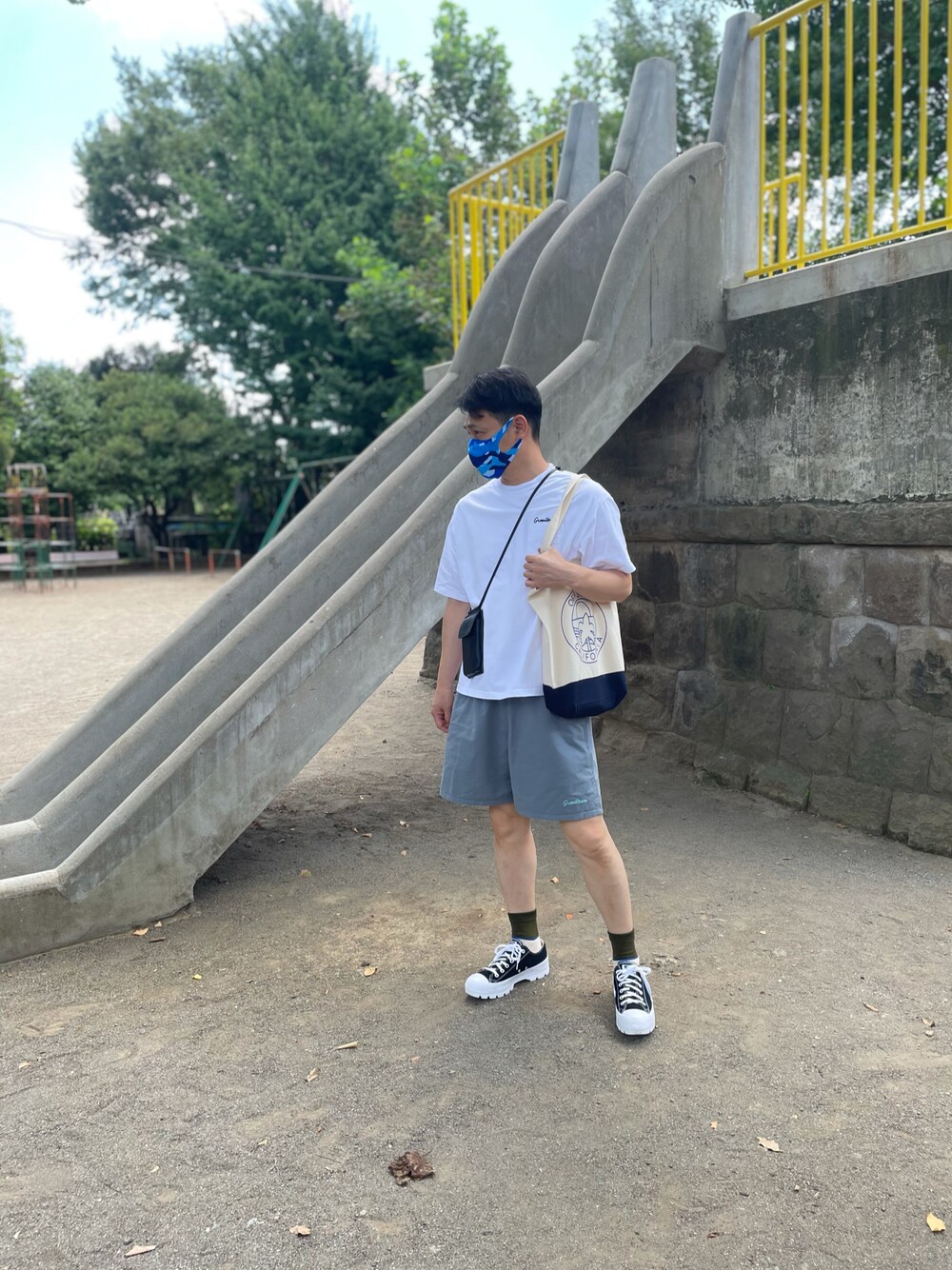 夏です。 シャツとショーツはGreen roomでロコな気分に。 低身長の自分には、海外コンバースで購入した、ソールが高めのオールスターで盛っています😅 ソックスは、よく見えませんがラコステ。最近お気に入りのブランドです!