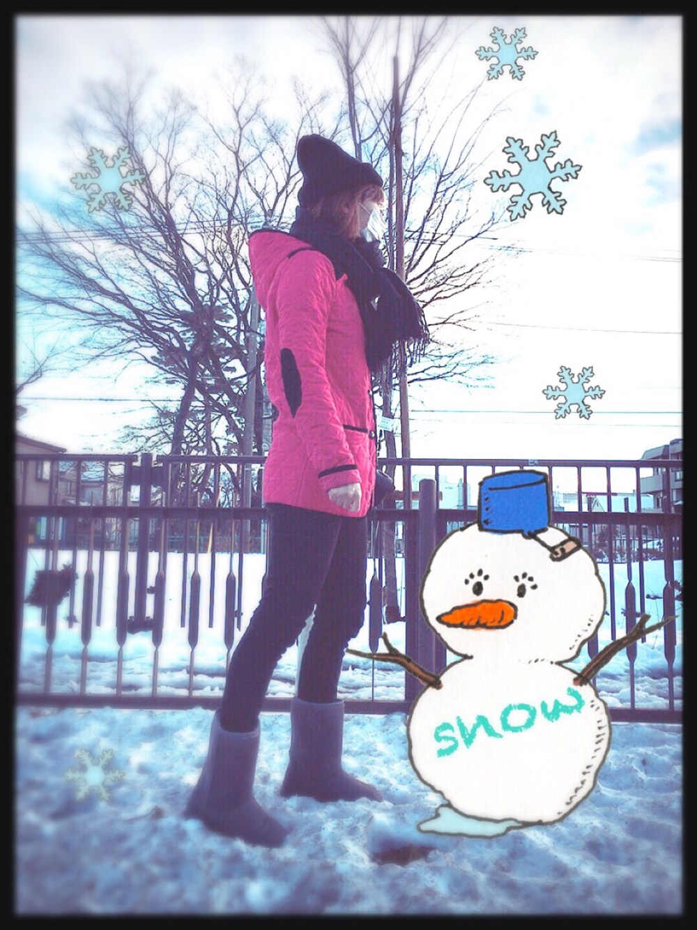 ついに雪降りましたね!⛄️ 早速、雪を堪能するべく 防寒して早朝に家を飛び出しました。サッ🏃💨 アウターはひじパッチ付きで裏地がドット柄の お気に入りキルティングジャケットです。