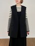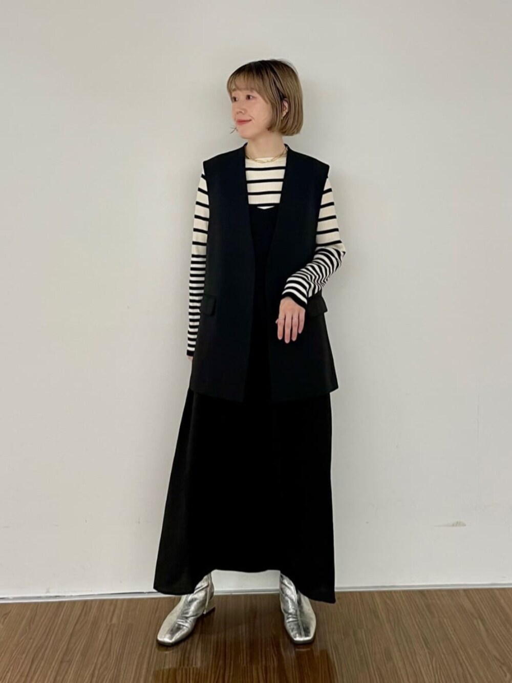 【ジレの着回しスタイル】 こんにちは。ザギャラリーワールドオンラインストア有楽町マルイ店の藤田です。 今日はジレを使ったワンピーススタイルのご紹介です♡ どんなコーディネートにも羽織れるジレはとっても便利。 羽織るだけで体型カバーもできるし、ポケットがついていて、通勤スタイルにもオススメです。 こちらのジレはシンプルな着流しデザインなので、オンオフ兼用して使えます。 丈も長すぎず、短すぎず、、 バランスが合わせやい着丈になっています✨ インナーにはスッキリ、リブニット。 マルチボーダーが大人っぽい。 肉厚素材で一枚でも着やすいです。 ワンピースは華奢な紐がかわいい♡ 寒くなったらタートルを合わせて着たいデザインですね。