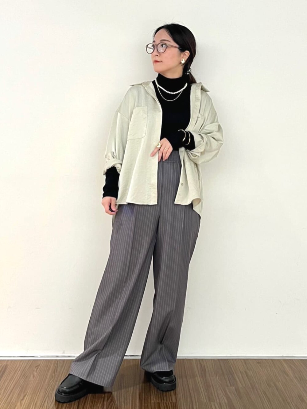 【秋のシャツ合わせ】 晩夏から人気だったサテンシャツ! インナーをタートルにして合わせたり、ボトムのカラーを落ち着かせて秋スタイリングに。 前後差があるシャツなのでイン/アウトどちらでも◎ ⚫︎シャツ ゆったりとして見えますが、サイズで作っているので大きすぎず合わせていただけます。 お尻が隠れる長さなので安心して着れる長さです♡ 小柄さんおすすめアイテムです♪ ⚫︎タートル フィット感があり小柄さんにおすすめです! 肌触りもよく気持ちいいのでインナーとしてお持ちいただきたい1枚です。 ⚫︎パンツ サイドラインがスッキリ見せてくれるワイドパンツ。 春夏よりサイズ感が大きく丈が長くなっています。 ウエストゴムですが幅広なので見えても気にならないデザインです♪