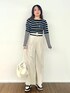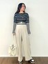 【シンプルリブニット】 切り替えでリブの太さが変わる一癖あるボーダーニット。 無地もあるけど、せっかくならこのボーダーを楽しみたいですよね♪ センタープレスのキレイ目ワイドパンツと合わせて 「シンプルだけどオシャレ」 なスタイリングにしてみました。 最後に羽織を合わせたスタイリングを載せてます。 ⚫︎トップス 02サイズ着用→ワンサイズ リブのフィット感がちょうどよく変なところ(脇や腕周り)が余らないので小柄さんにおすすめです! シルエットが本当に綺麗です。 ⚫︎パンツ 36サイズ着用。 少し緩めのパンツです。 春夏の今までのに比べると丈長めです。 ハイウエストで履いたらヒールなしでも大丈夫です。