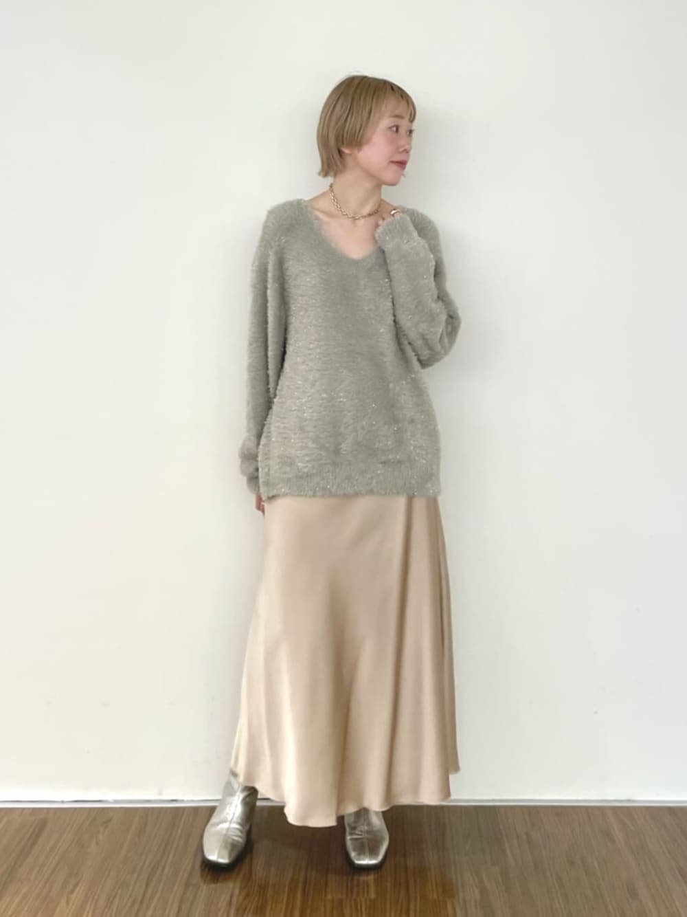 ⚪︎knit/毛足が長くふわふわした素材が柔らかく気持ちいい着心地のニットです。 深めなVネックで一枚で着ると肌見せが女性らしい雰囲気に♡ 少し肩を落として着ても素敵です。 ラメが華やかで、これからイベントが増える季節にもオススメです✨ ⚪︎skirt/マーメイドの女性らしいシルエットです。サテンの生地がおしゃれな雰囲気に♡ オールシーズン使える素材なので色違いでほしくなります。 ウエストもゴムでらくな履き心地◎
