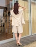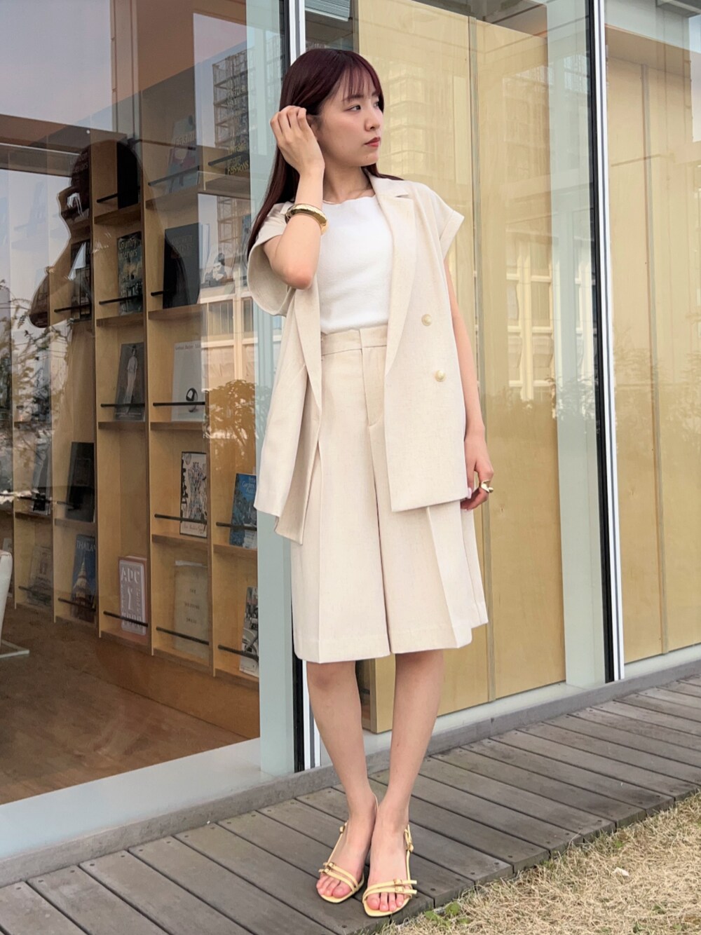 タンクトップ▽ ブークレ素材の表面感が上品で、シンプルながらも存在感◎ 柔らかな肌触りがとても心地良く、程よいフィット感があるので、ジレやカーディガンとのレイヤードスタイルにもぴったり。 ジレ▽ リネン混素材の涼しさと、ゆるっとしたオーバーサイズがこなれ感。 今年らしいシルエットで着るだけで旬な雰囲気になるのが嬉しいポイント。 パンツ▽ ハーフパンツですがひざがが隠れる絶妙な丈感でカジュアル過ぎない! センタータック入りで大人でも挑戦しやすいアイテム。