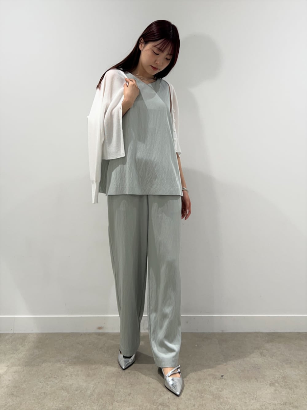 セットアップで通勤にもマッチするキレイめスタイル♪ トップス▽ フレアラインがとてもきれいで、動くたびに柔らかく揺れる感じが上品で女性らしい。 丈感も絶妙で、パンツと合わせた時に全体がすっきり見えるバランスが◎ セットアップで合わせると、きちんと感が高まり、オフィスやちょっとしたおでかけにもぴったりです。 パンツ▽ さらっとした素材感がとても気持ち良く、ウエストゴムで履き心地もストレスフリー。 程よくストンと落ちるシルエットが足をすっきり見せてくれて、広がりすぎない適度なボリューム感がちょうどいいです。 カーディガン▽ 薄手でさらっとしていて、暑い日の日よけや冷房対策にぴったりの一枚です。 シアー感が程よく透けて軽やかな印象を与えてくれ、どんなスタイルにも馴染むのが嬉しいポイント!