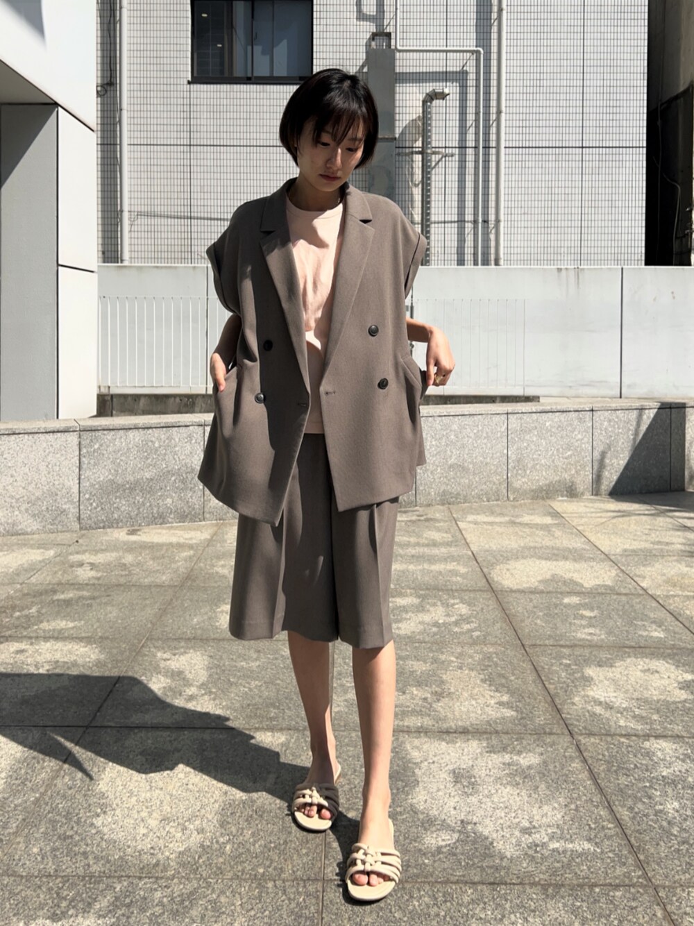 ハーフパンツのセットアップでお出かけスタイル ジレ ▽ ゆるっとしたシルエットがリラックス感があって可愛い! シンプルなTシャツやタンクトップとの相性抜群で、カジュアルにもきれいめにも使いやすい万能アイテムです! パンツ ▽ 大人のための膝丈ハーフパンツ♪ 長すぎず短すぎない絶妙な丈感で、脚を程よく出しつつも品良く見えるのが嬉しいポイント。 シンプルなデザインながら、シルエットがきれいで上品なので、ジレやブラウスと合わせればきれいめカジュアルスタイルにも◎