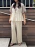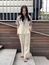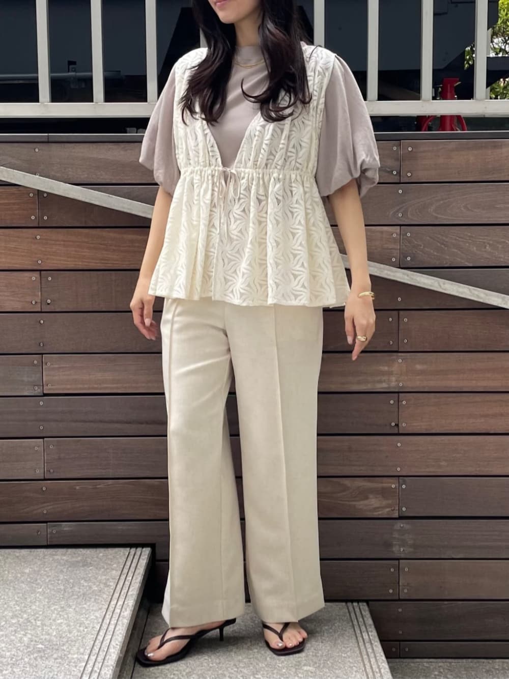 tops バルーンスリーブのシルエットがフェミニンな印象に。 身頃はすっきりフィット感があるので女性らしいシルエットに仕上がります。 細かいラメが入っていて一枚でも着映えます♡ blouse お花のレースデザインが可愛いくコーディネートのアクセント! ウエストを絞れるので、スタイルアップ効果も◎ すっきりめのトップスやワンピースとも合わせやすいアイテムです。 pants リネン混の素材で清涼感があるワイドパンツ。 ウエストゴムで楽ちんな履き心地です◎ ベーシックなのでこの夏着回せること間違いなし♪