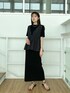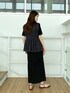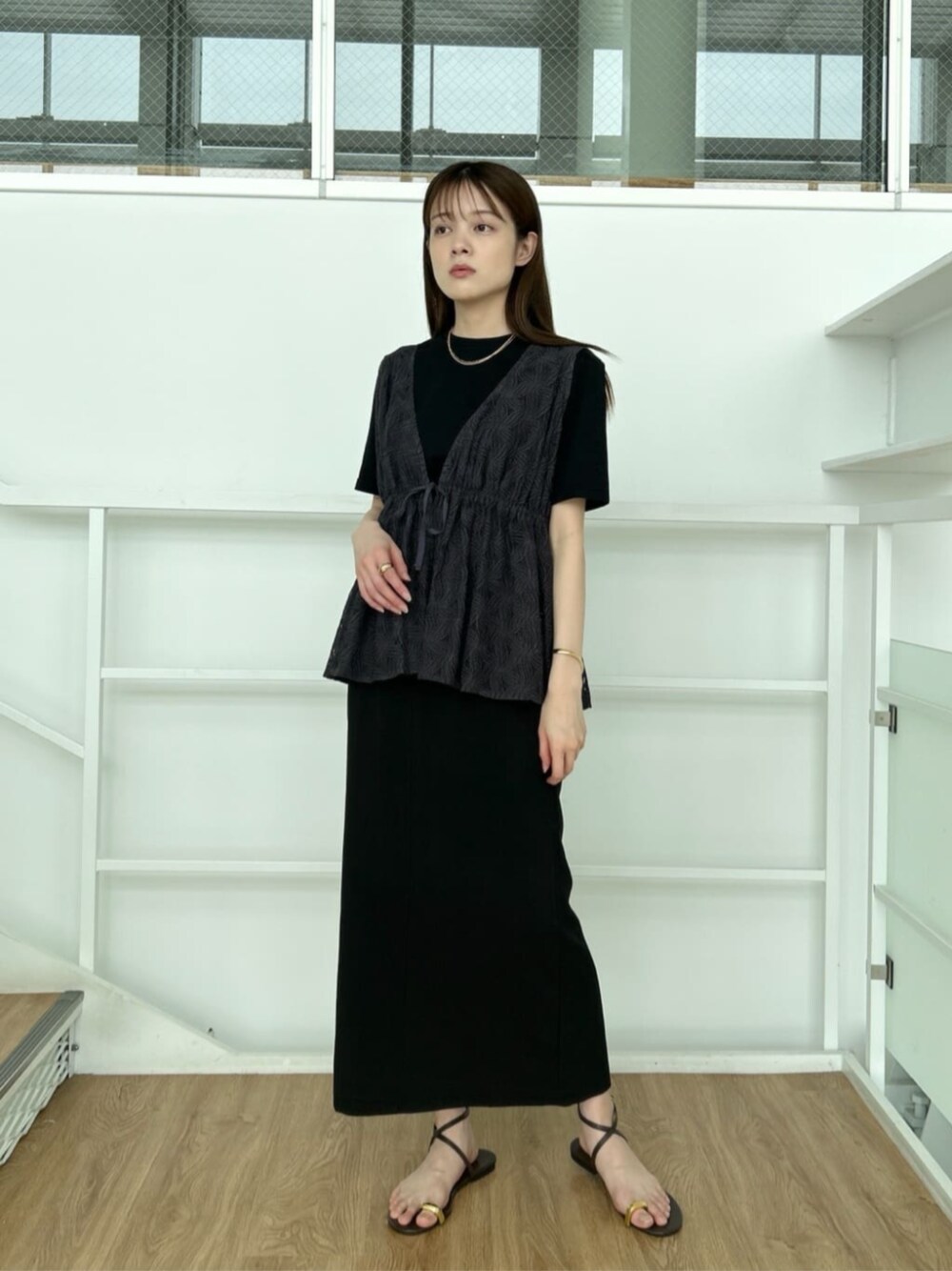 blackワントーンでレースアイテムでも大人っぽく tops ベーシックで着回しやすい! ややスリムなシルエットで重ね着に◎ UVカット•接触冷感で汗ばむ気温でも快適に過ごせます! blouse 女性らしいフラワーレースが可愛い♡ ウエストで絞れるのでウエスト位置を高く見せてスタイル良く見せてくれます。 skirt 軽やかで涼しげなワッシャー素材。 バックゴムで履き心地も抜群です! ストレートなシルエットで大人っぽくまとまります。 スリット入りなので動きやすさもポイントです。