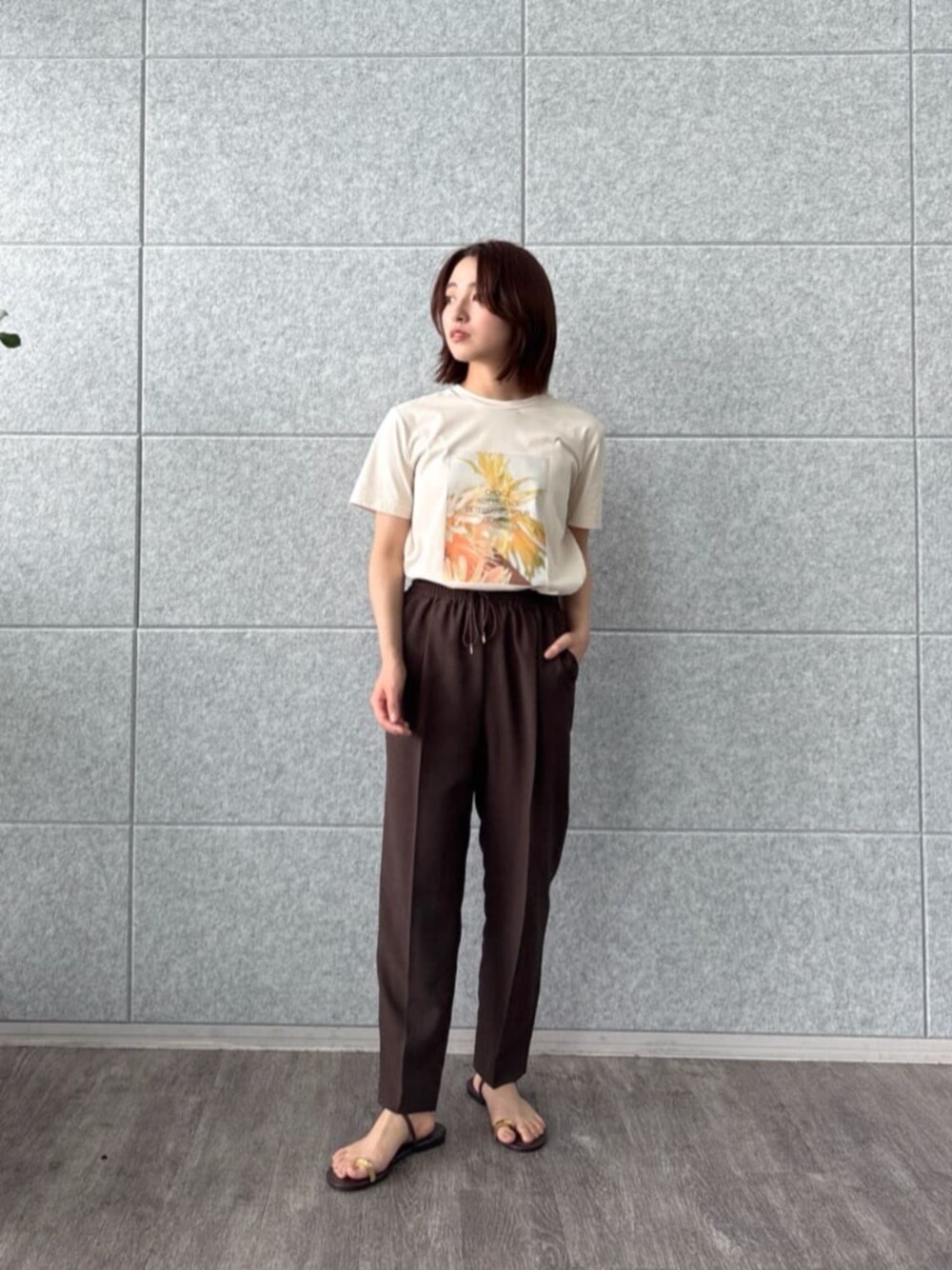 ・Tシャツ 鮮やかなプリントが目を引く一枚で、カジュアルながらも存在感があります。 柔らかい素材が心地よく、普段使いに最適。軽やかな印象で、どんなコーディネートにも合わせやすいです。 ・パンツ ウエストのゴム仕様が楽ちんで、リラックスした着心地。 すっきりしたシルエットがスタイルアップを叶え、トップスとのバランスが取りやすいです。おしゃれも快適さも両立したアイテムで、日常使いに重宝します!
