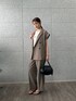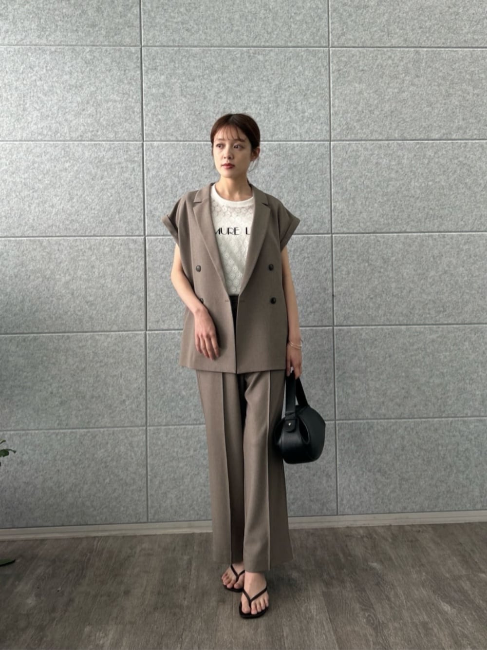 リネンの柔らかくナチュラルな風合いが魅力のセットアップ •jacket ゆったりとしたサイズ感でこなれた雰囲気に。 肩周りがすっぽり隠れる袖丈なので二の腕も自然にカバー。 縦長の襟が、Iラインを作ってすっきり見え効果も◎ •tops 大人が着こなしやすいキレイめロゴトップス。 レースに程よい透け感が上品な印象に。 • pants 楽な履き心地ながらもキレイ見えを叶えるパンツ。 センターラインが脚をすっきりとみせてくれます。 ウエストは紐付きで調整可能です。