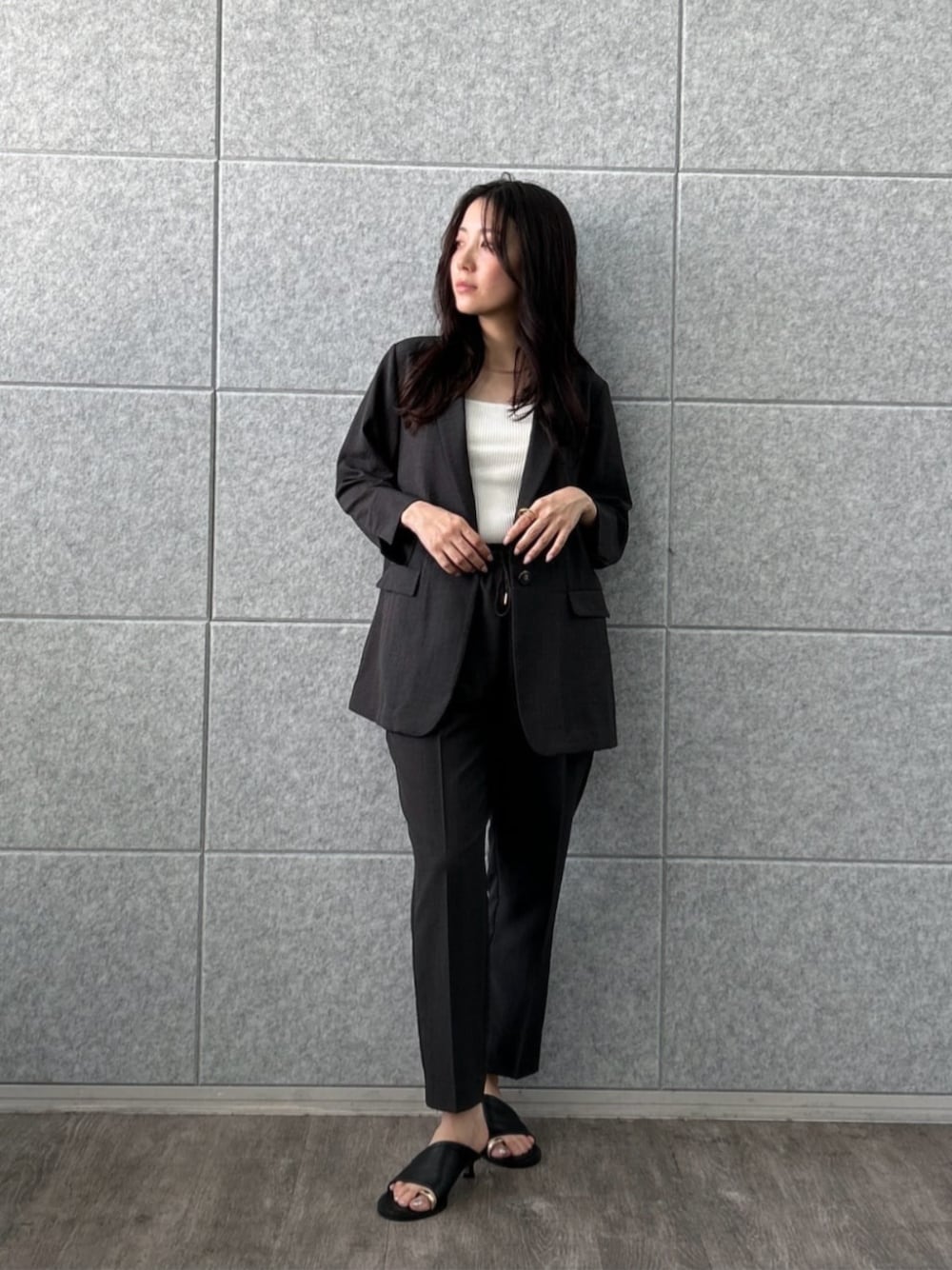 camisole カップ付きで伸縮性のある素材。 程よくフィットしてくれ着心地も◎ オールシーズン活躍してくれます。 jacket 薄手でドライタッチな肌触り。 さらっと夏でも涼しく着ていただけます。 きちんと感がありオフィスにもぴったりです。 pants ウエストゴムで快適な履き心地。 テーパードラインがすっきり見え効果も ◎ シワにもなりにくいのでデスクワークでも安心です。