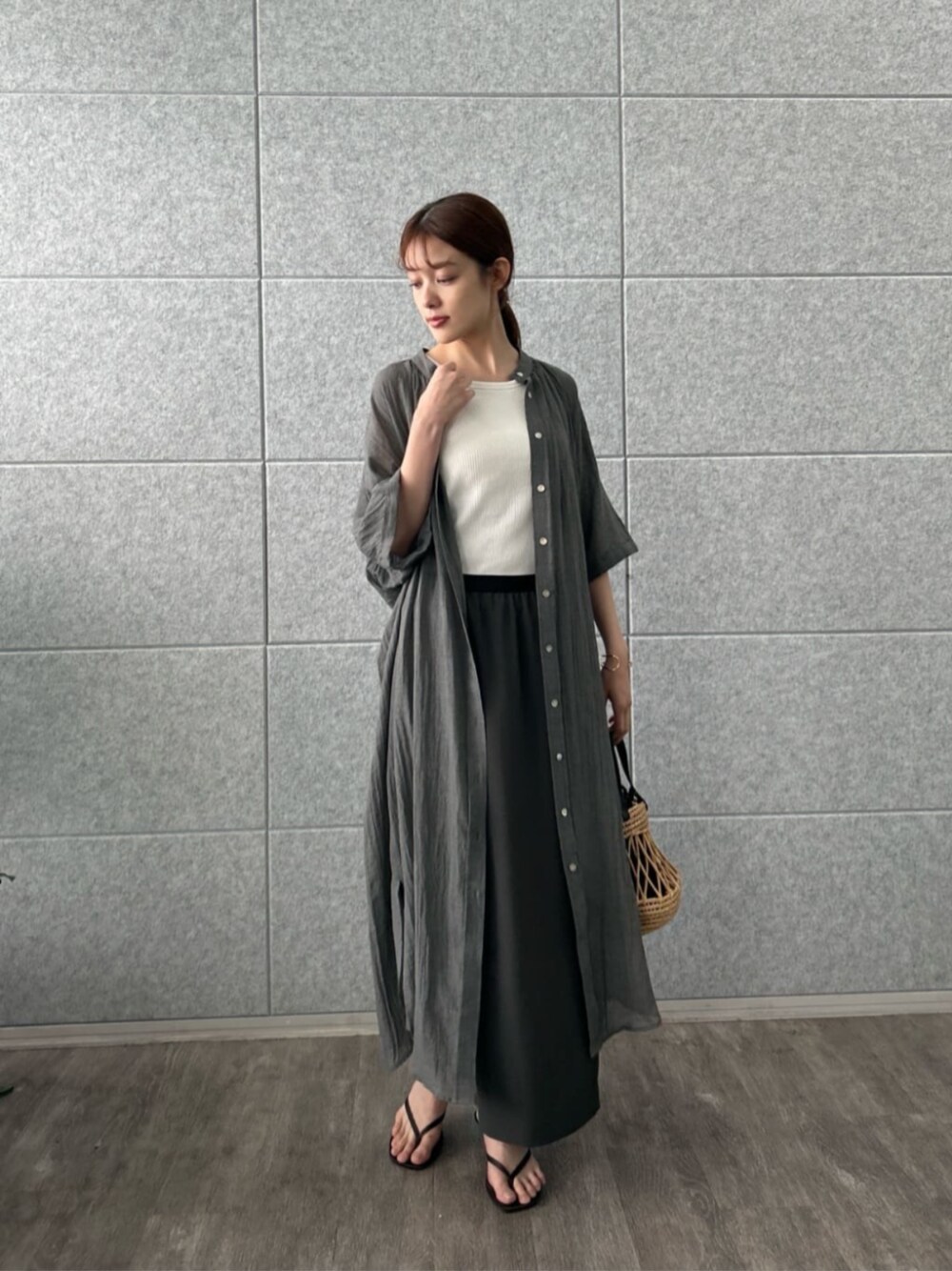 •tops 伸縮性のあるベーシックなタンクトップ。 カップ付きで夏に着回しやすいアイテム。 •one-piece ロング丈で大人の雰囲気に着こなせるワンピース。 肘まですっぽり隠れる袖丈なので、紫外線対策にもぴったりです。 さらっと羽織れる軽さががポイント。 • skirt キレイ見えするデザインながらもウエストゴムで楽な履き心地。 通気性のよい薄手の素材で夏にぴったりです。 身体のラインを拾い過ぎないのが嬉しいポイント。