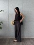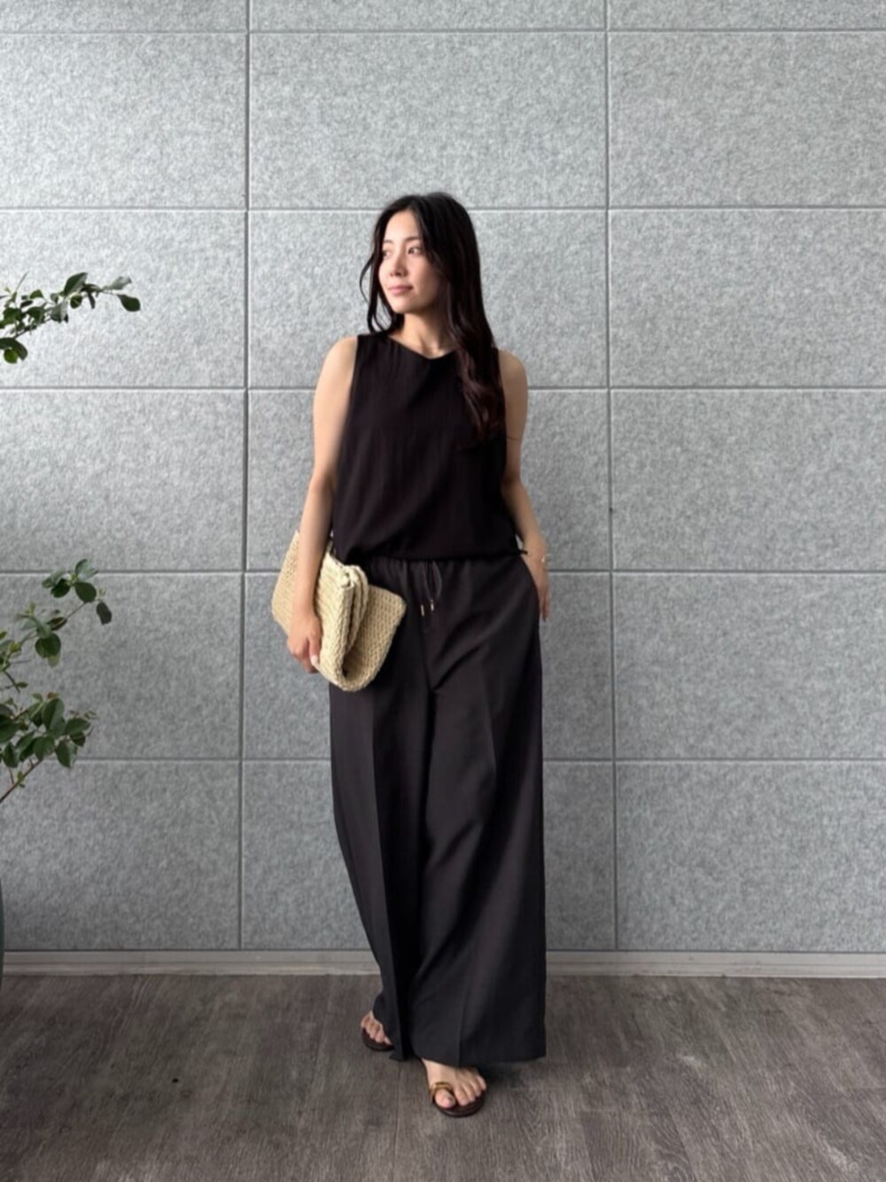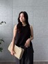 TOPS シンプルながらも体にフィットして、すっきり見せてくれるデザイン。柔らかな生地で、涼しさを感じながら着用できます。 PANTS ゆったりしたシルエットで、リラックス感満載。上品さも残してくれるので、カジュアルからちょっとしたお出かけまで幅広く活用できる一着です。 全体をブラックで統一しつつ、バッグやサンダルでアクセントを効かせているのがお気に入り。シンプルでありながらもおしゃれ感があって、非常に使い勝手が良いアイテムです。