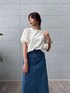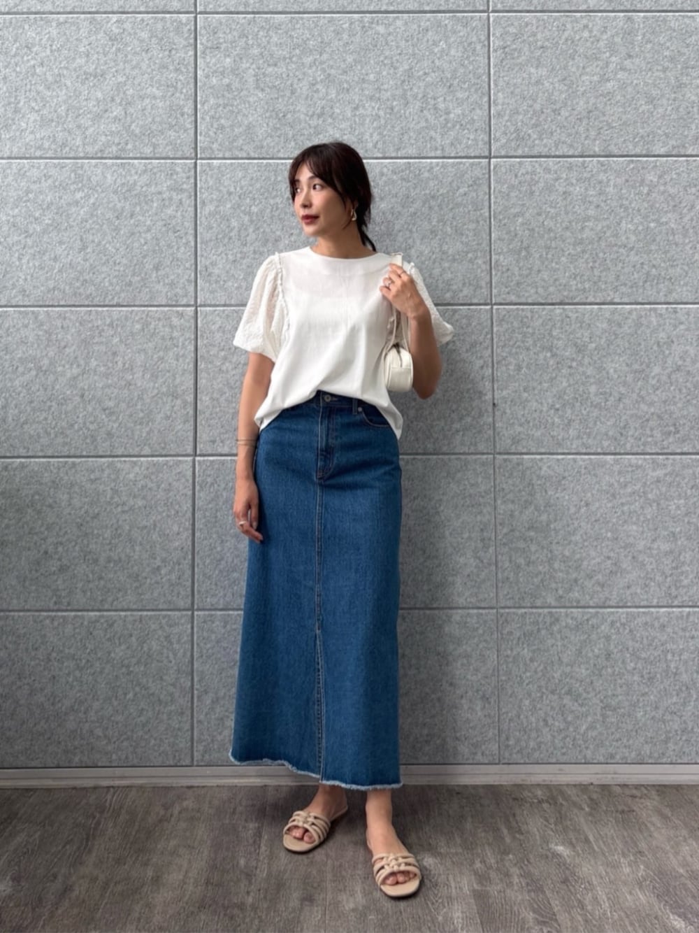 トップス ふんわりとした袖が魅力的で、女性らしさを引き立てます。 軽やかな素材感があり見た目にも涼しげで、夏にぴったりな一枚です。 スカート 定番のデニムスカートですが、シルエットが美しくスタイルアップ効果があります。 スリット入りのデザインで、動きやすさも兼ね備えていて、カジュアル感と上品さが絶妙に両立しています。 清潔感と上品さが感じられるコーディネート。 公園での遊びやカフェでのひとときに、気軽に着こなせるところが特にお気に入りです!