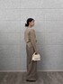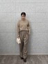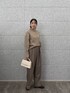 トップス シンプルなハイネックのニットは、顔まわりをすっきり見せてくれる効果も◎。 適度なゆとりがあるので、体のラインを拾いすぎず安心して着られるアイテムです。 柔らかなベージュトーンはどんなボトムスとも合わせやすく、着回し力抜群。 パンツ ウエスト周りにタックの入ったワイドパンツは腰回りをさりげなくカバーしてくれるので心強いです。 トップスをインしてウエスト位置を高めに見せると、脚長効果も狙えます!