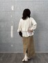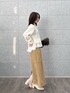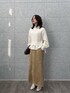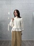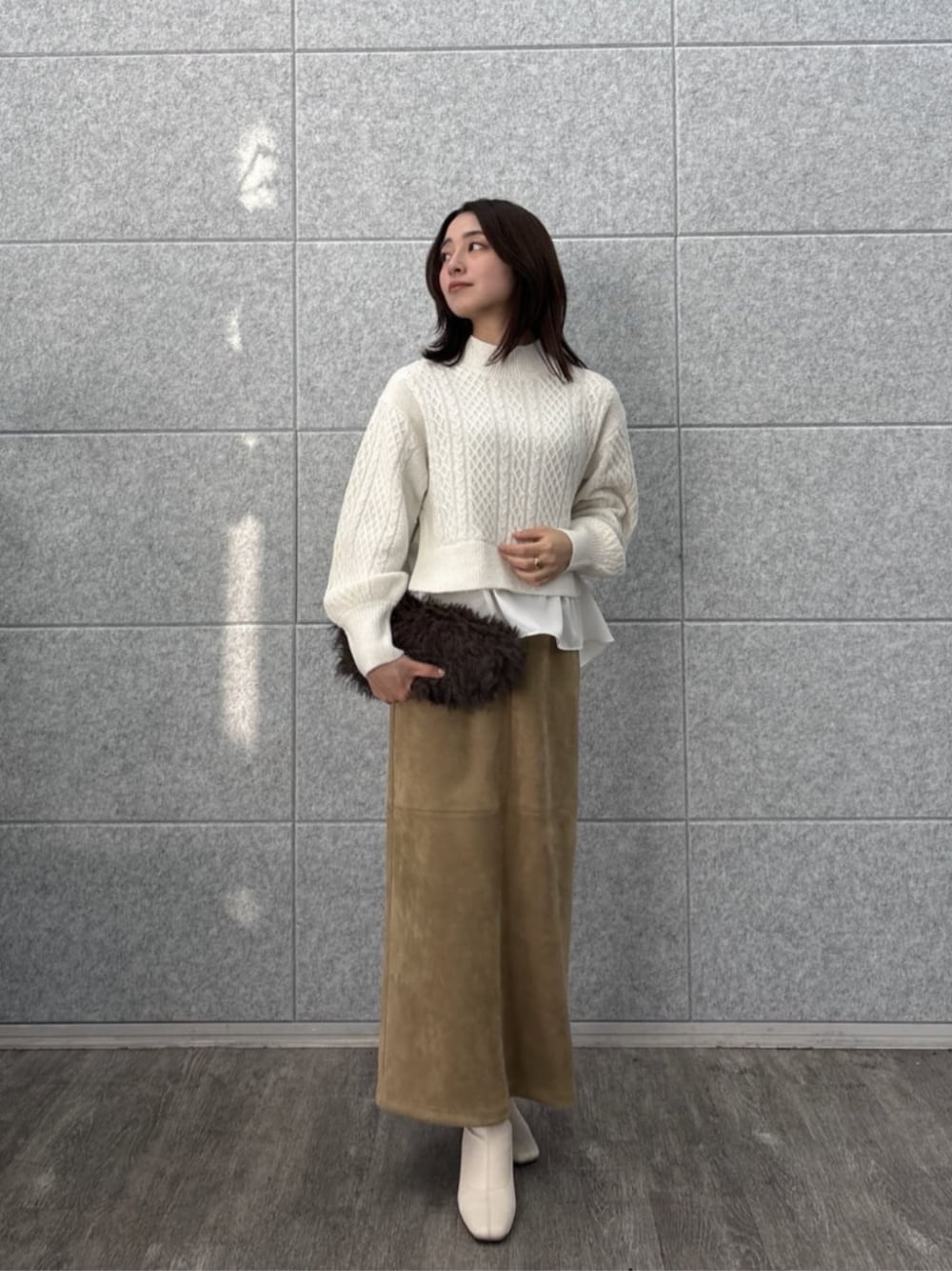 柔らかく女性らしい雰囲気。 短め丈のニットがウエストの位置を上げてくれるので、美脚効果も◎ レイヤードされた裾がふんわり動いて、シンプルながらも奥行きのあるスタイルに。 スエード調のスカートが落ち感を強調し、すっきりとした自然なラインを作っています。