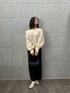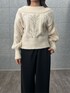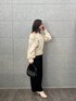 オーバーサイズのざっくりニットが柔らかい印象を与えつつ、オフショルにして女性らしい雰囲気。 透かし編みのデザインが一枚でも華やかに決まるポイント。 ワイドパンツとの組み合わせで甘くなり過ぎず大人っぽく仕上げています。 アイボリーのショートブーツで足元を柔らかくまとめつつ、黒のバッグが全体を引き締めてアクセントに。