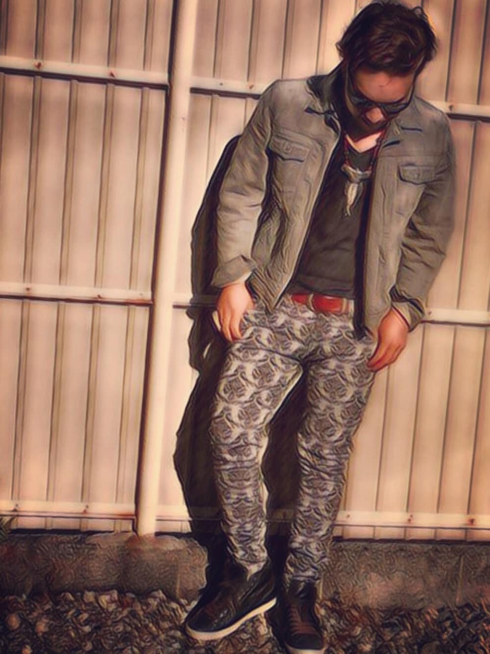 モノトーンコーデ グレーデニムジャケット×グレー柄パン×ブラックスニーカー