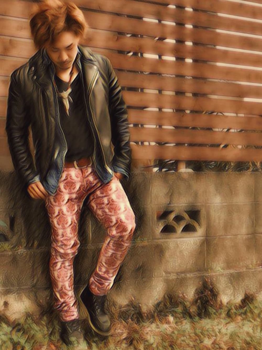 ライダース×デニムシャツ×柄パン