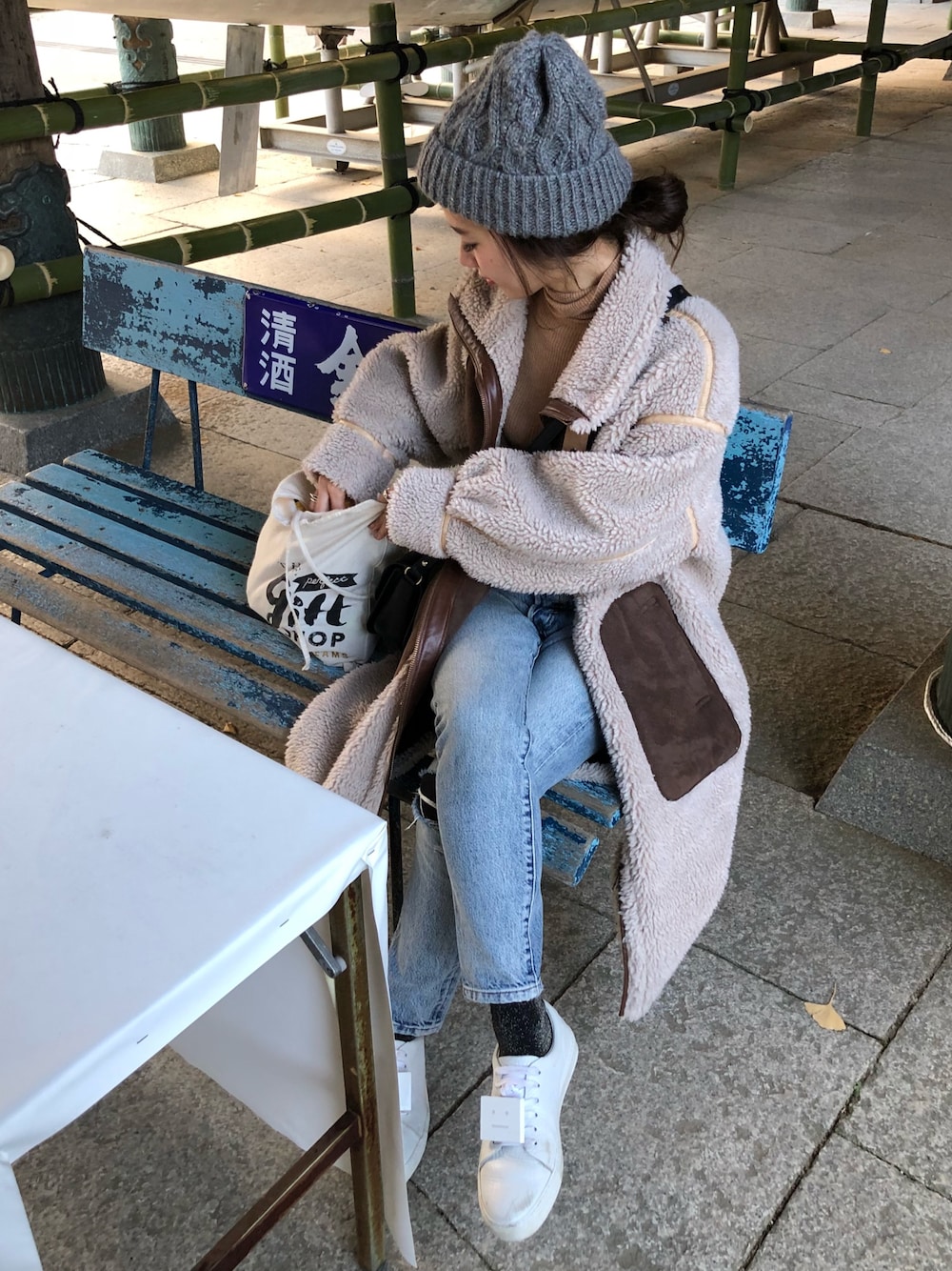 miisuuzuukiiのニットキャップ/ビーニー「BY∵ ファーポンポンケーブルニットキャップ」を使ったコーディネート