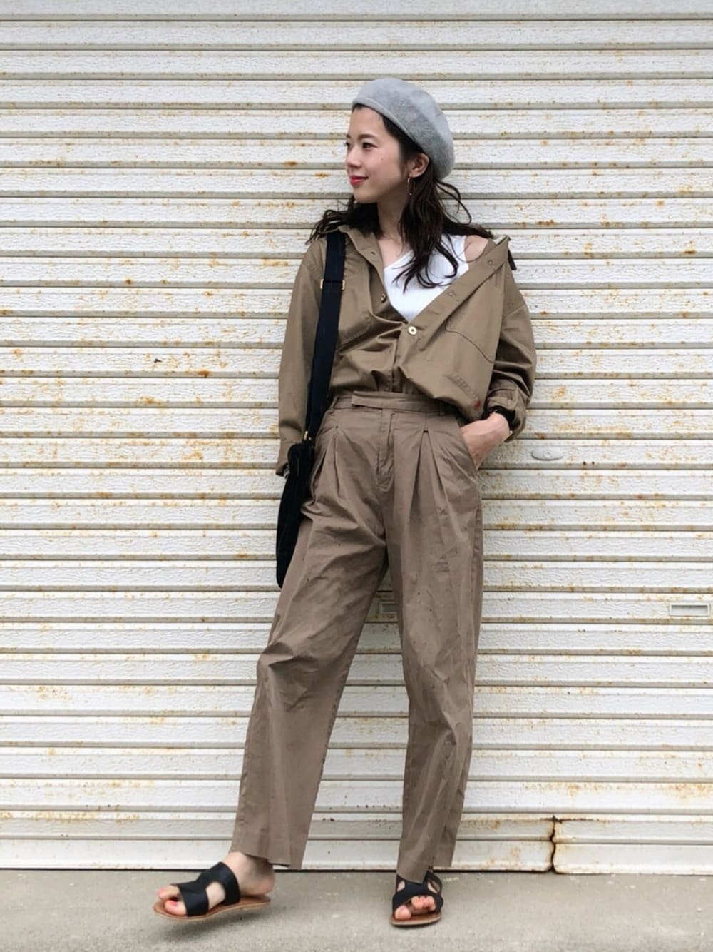 メンズライクな ワークシャツを 襟抜きしてワンショルダー見せ👀 同系色なパンツと合わせて セットアップ風です😊❣️