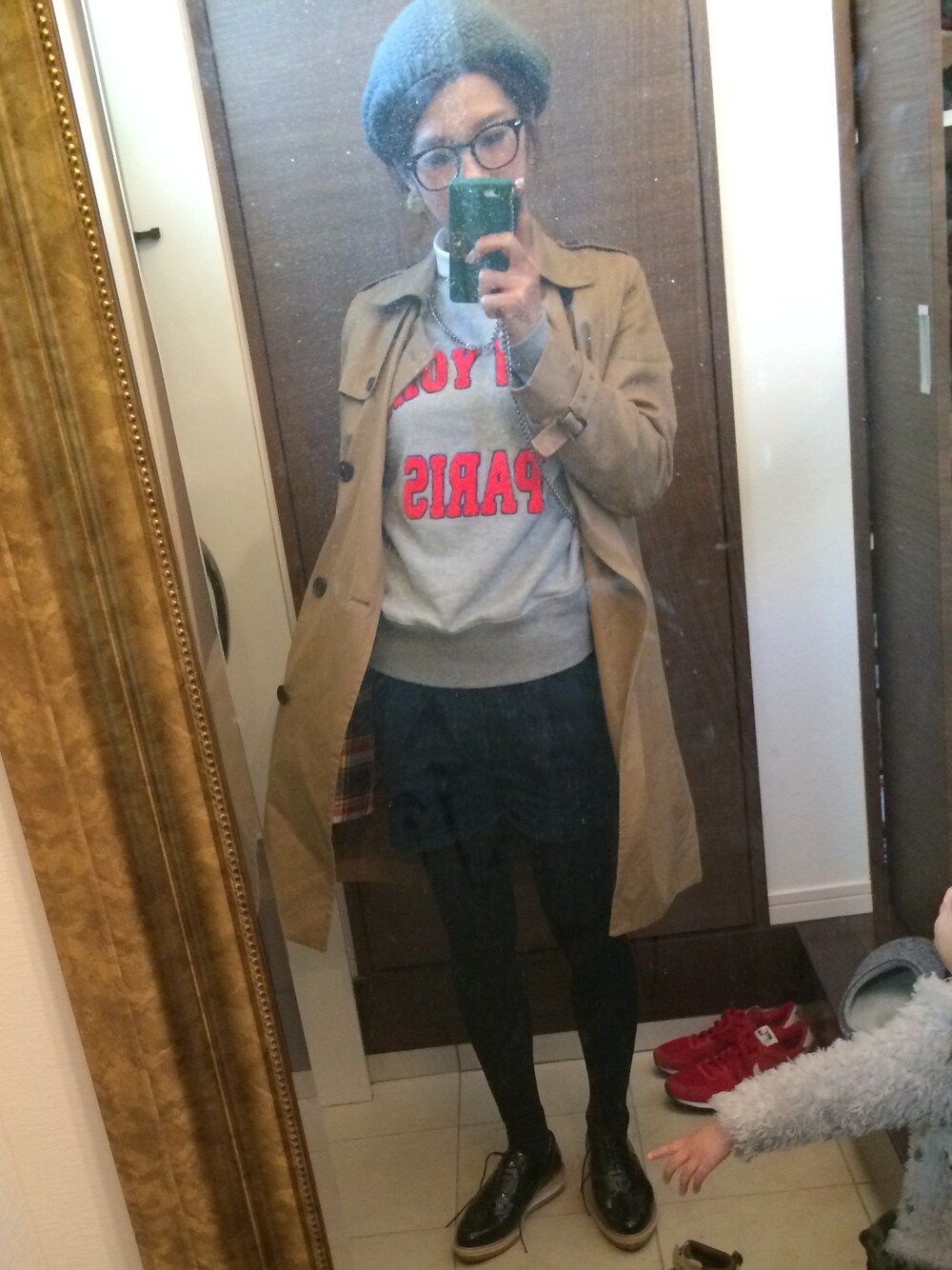 ベレー帽+伊達眼鏡+トレンチコート 好きな組み合わせ。