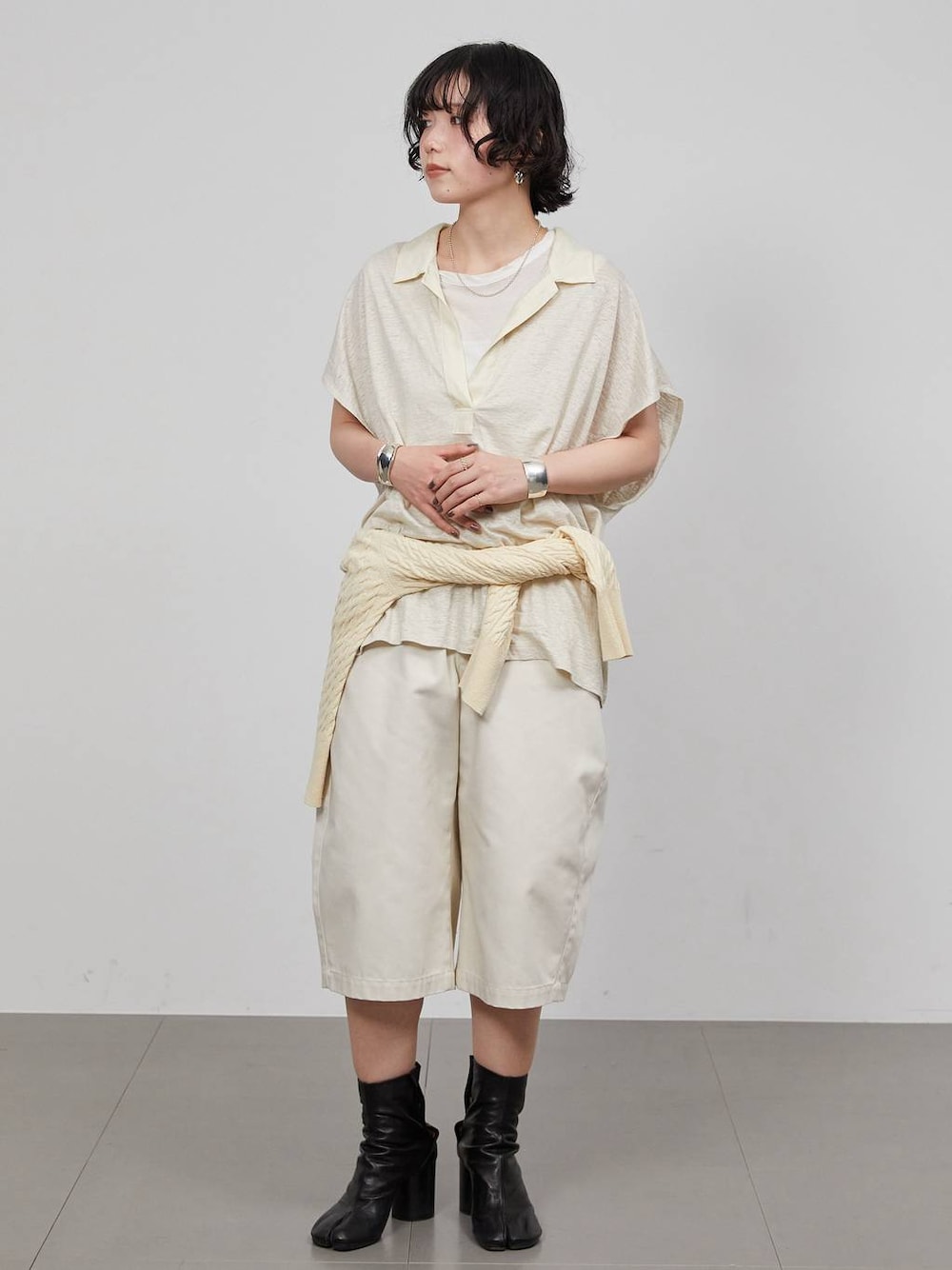 【トップス】 リネン100%で仕立てたボクシーポロTシャツ リネン特有の風合いと、程よい透け感。 滑らかな肌触りに加え、洗いを施すことであえてクタッとした表情に。 シンプルながらも、抜け感のある一枚 【ボトムス】 カーブシルエットが印象的な大人のハーフパンツ チノパンのようなハリ感のある生地で足のシルエットが出ず立体的なフォルムに。 ウエストからやや落として履くと、ふくらはぎの下あたりの着丈でした。 WEAR : @clshino Instagram :