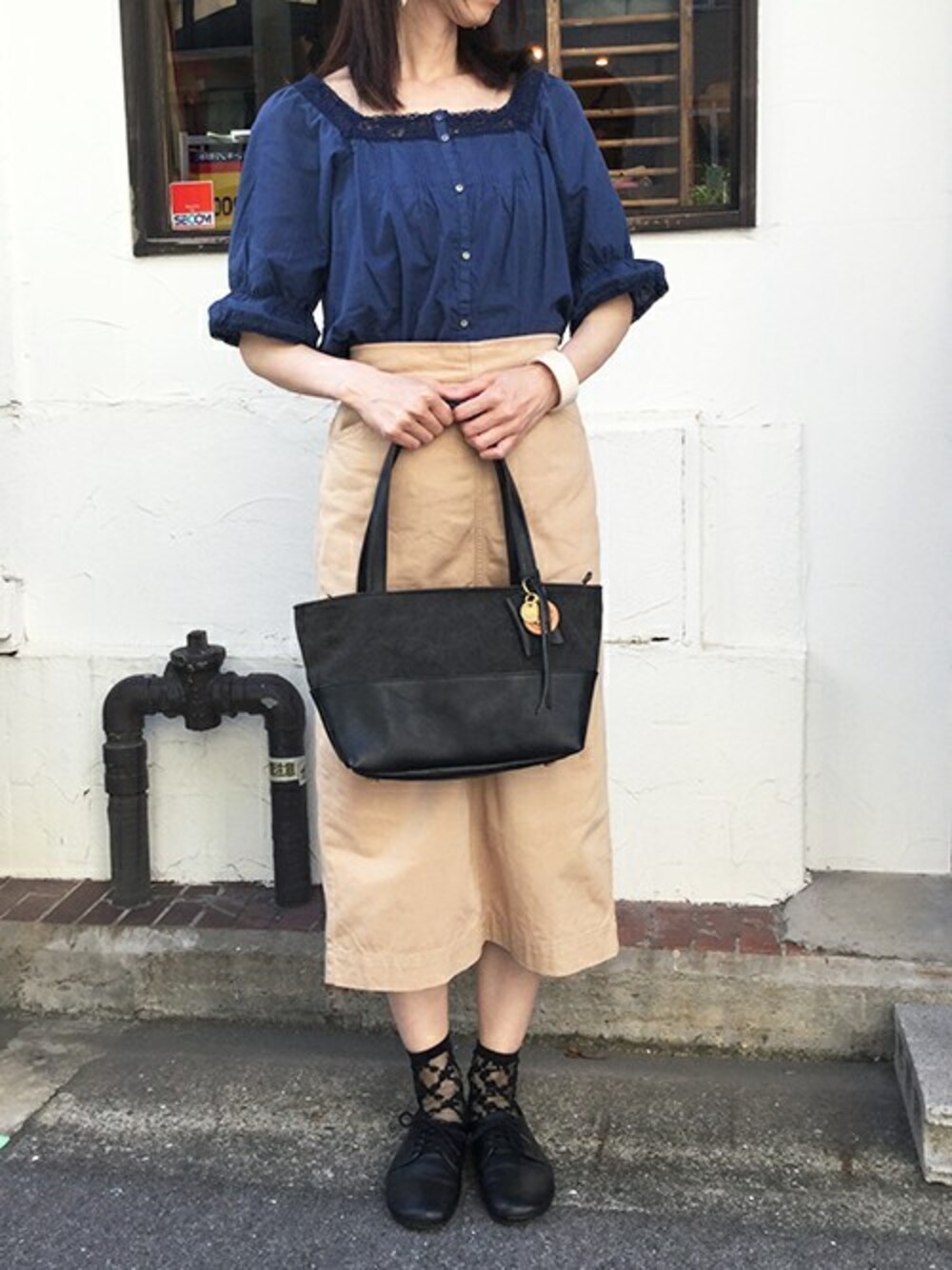 クラシカルな雰囲気の洋服に、炭染めの生地とレザーを組み合わせたトートバッグで全体を引き締めました。 このバッグは帆布を使っていますがカジュアルになりすぎないデザインが気に入っています。 大きいサイズも販売しているので通勤とお出かけで使い分けたい!