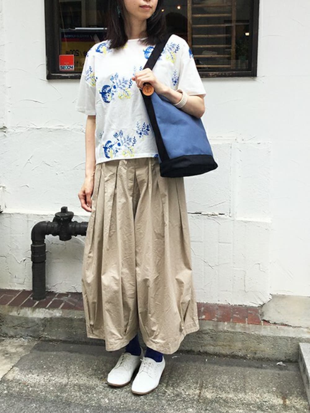 ブラウスに刺繍されている青い鳥とバッグの色を合わせて夏らしい爽やかなコーデにしてみました。 見た目にも涼しいブルーのバッグは、暑い夏にたくさん使いたい。 軽い帆布なのでお出かけにも通勤通学にも使いやすいです!