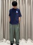 ネイビーのカットソーとグリーンのカーゴパンツを合わせたコーデです。 ゆるっとしてラフなコーデですが、革靴を履くことで締まったイメージを意識しました。 Tシャツのデザインが映えていい感じです!