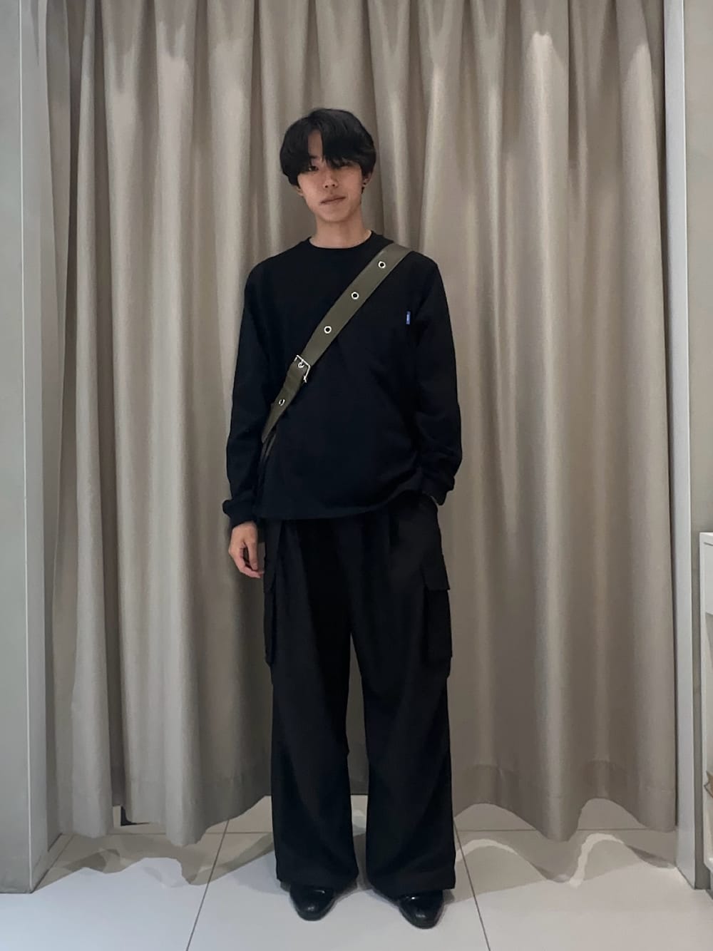 ブラックのロンTとブラックのカーゴパンツを合わせたオールブラックコーデです。 毎年登場しているロンTとは違い、ポケットがついていることや小さくロゴが入っているのが今回のロンTです。 また今年の売れ筋ベスト3に入るであろうパンツであるカーゴパンツはSSの時とは違い生地が少し分厚く、通年履ける生地感です。そのロンTとカーゴパンツを合わせたオールブラックコーデですが、ワンポイントとしてカーキのショルダーバッグを取り入れました。マチがあるバッグのため、丈夫で重いものが入れられるバッグです!通学などにもご利用頂けます!
