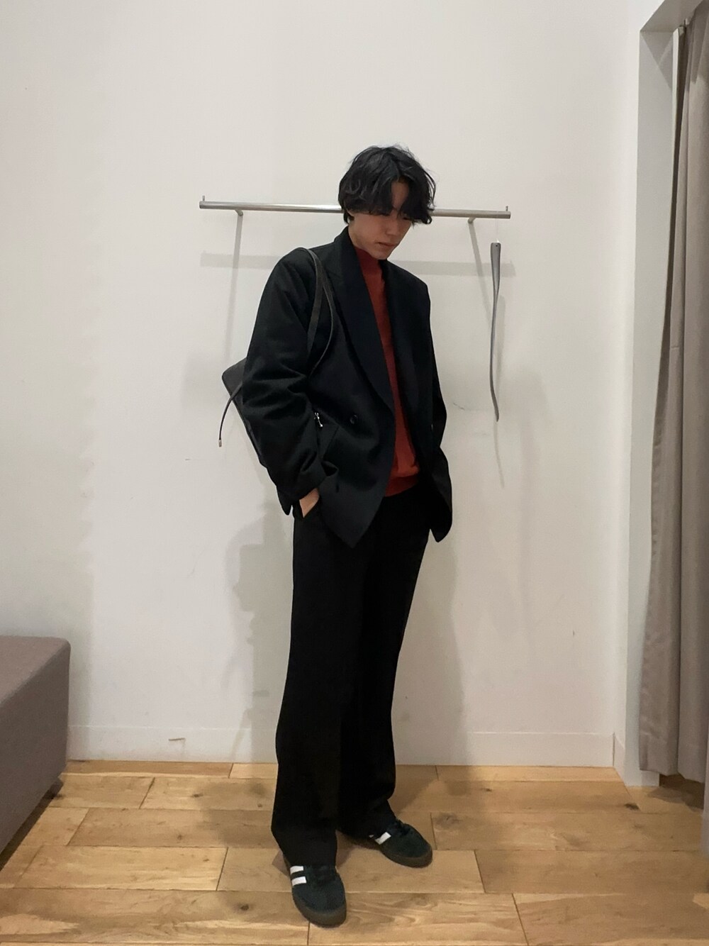 オレンジのモックネットニットにジャケットを合わせたセットアップコーデです。 セットアップのアイテムは素材が柔らかいため、スニーカーとも合わせやすいアイテムです! ボストンバッグは流行りの形で、フェイクレザーですが、テカテカとしてる感じとは違い、ヴィンテージ感が出せます。