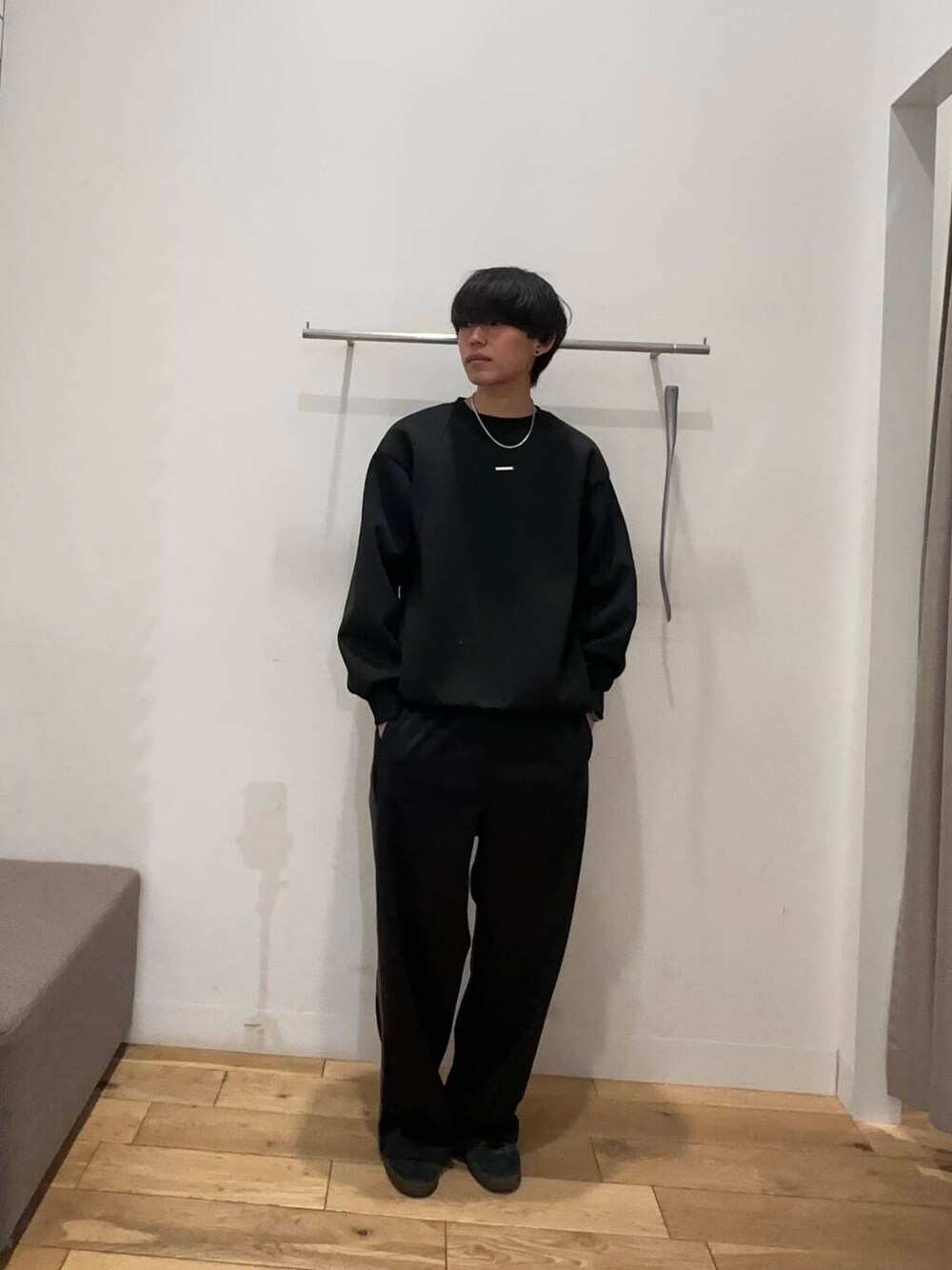 ブラックのスウェットとブラックのラインパンツを合わせたオールブラックコーデを組みました。 身幅が広く、着丈が長すぎないこちらのスウェットは圧迫感があまりなく、ゆったりとしたシルエットが特徴のアイテムです。 昨年にも登場していたラインパンツは今季も登場しました。 こちらは丈が長く、フルレングスで着用することができます。 着丈が長すぎないスウェットと丈の長いラインパンツを合わせることでラフ感+こなれ感が出せるコーデになりました。