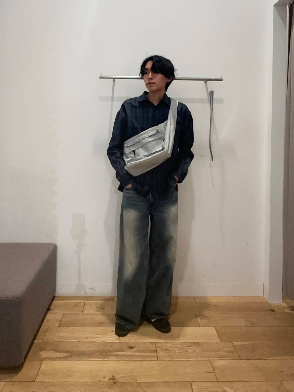 ブルーのチェックシャツにブルーのデニムを合わせたコーデを組みました。 サラサラとし、硬い生地感の為、かっちりしたアイテムです。 大きすぎないシルエットなので幅広い年齢層で着用することができるアイテムになっています。 現在50%offのボディバッグは大きめのイーガード(?)が付いており、可愛らしさがあります。