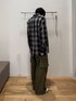ブルーのチェックシャツとグリーンのカーゴパンツを合わせたカジュアルコーデです。 ゆったりとしたシルエットが特徴のこのシャツは、ワイドパンツに合わせるとよりシルエットが生かされます。